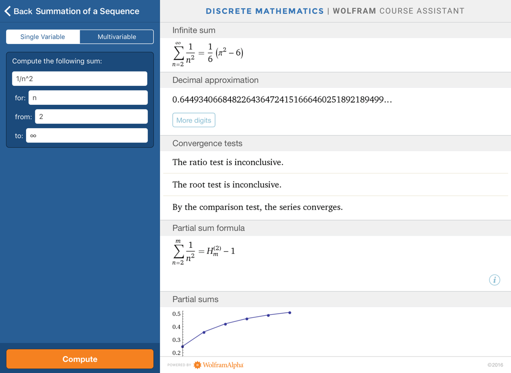 The Wolfram Discrete Mathematics Course Assistant draws on the computational power of Wolfram|Alpha's supercomputers over a 3G, 4G, or Wi-Fi connection.