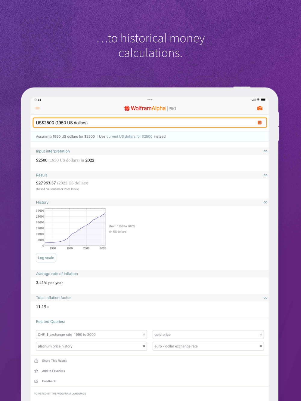 Become a Wolfram|Alpha Pro member to unlock step-by-step solutions, photo input, Input Assistants and more. Payment will be charged to your iTunes account at confirmation of purchase. Your subscription automatically renews unless auto-renew is turned off at least 24 hours before the end of the current period. Your account will be charged for renewal within 24 hours prior to the end of the current period. Subscription fees are $9.99 per month or up to $59.99 per year depending on your plan. You can manage your Wolfram|Alpha Pro subscription by visiting the iTunes Account Settings after purchase. Any unused portion of a free trial period, if offered, will be forfeited when you purchase a Wolfram|Alpha Pro subscription.
