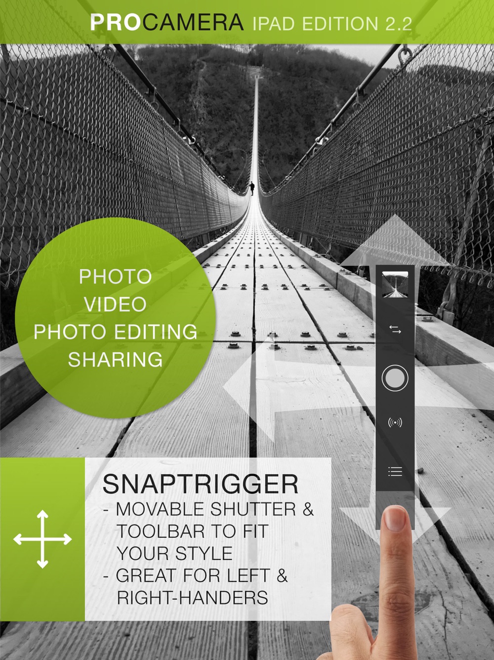 ProCamera HD是iOS专业摄影的黄金标准,它不但为初学者提供了一个高度直观的界面,还为摄影家们提供了一系列能与DSLR相机媲美的惊艳控制功能。ProCamera 将 iPad 的硬件功能发挥到极致,不仅直观易用,更能根据需要无止境深入!