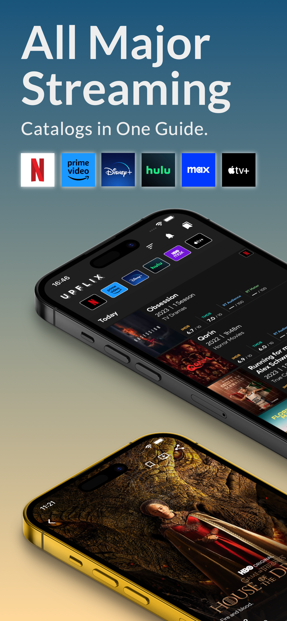 Your ultimate guide to movies and series on the major streaming services. If you're a subscriber to Netflix, Disney, Prime Video, HBO Max, Hulu, or AppleTV, Upflix is perfect for you!