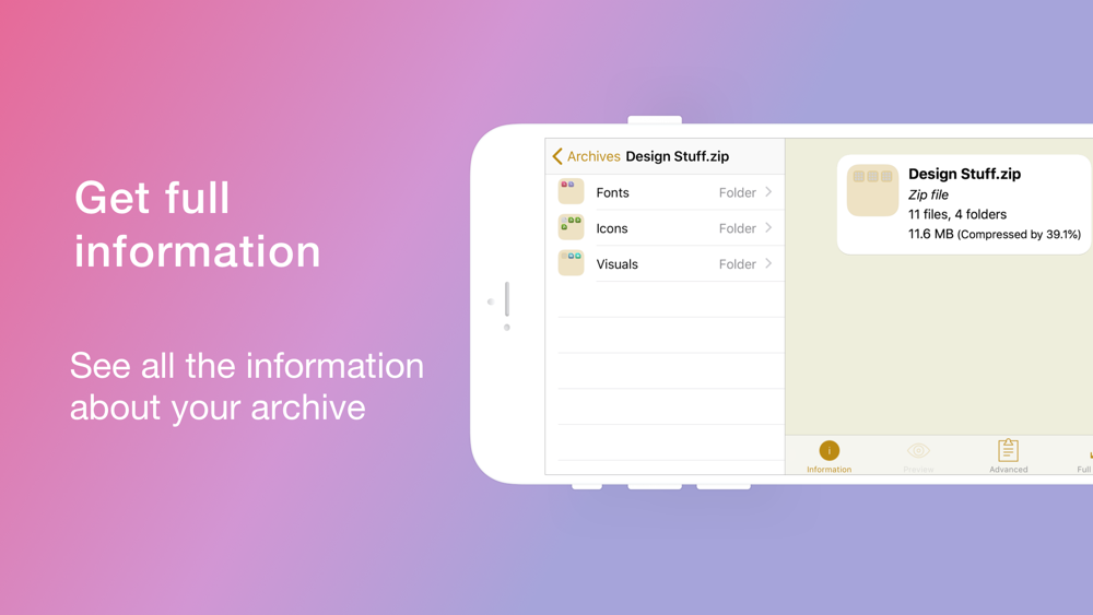 It can open files that have been mailed to you, files you encounter on the web, or even files from your computer through iTunes file sharing. It lets you preview the files inside archives, such as text, images or music. If you have another app installed that can open a file, Archives can also use that app to open contained files.