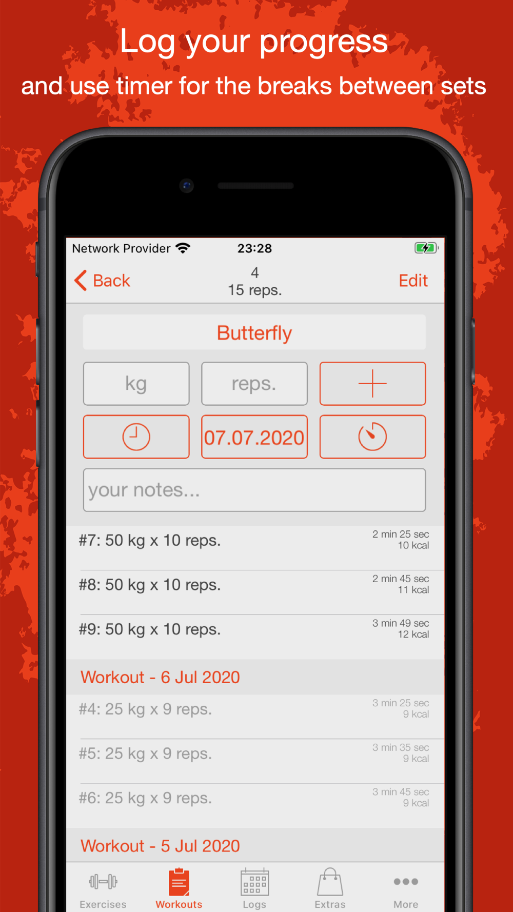 - Graph to visualize your log data for each exercise (including workload and RM calculator)