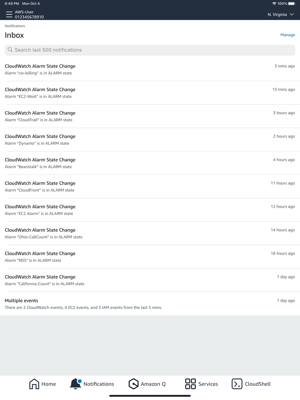 The AWS Console Mobile Application, provided by Amazon Web Services, lets you view and manage a select set of resources and receive push notifications to stay informed and connected with your AWS resources while on-the-go.