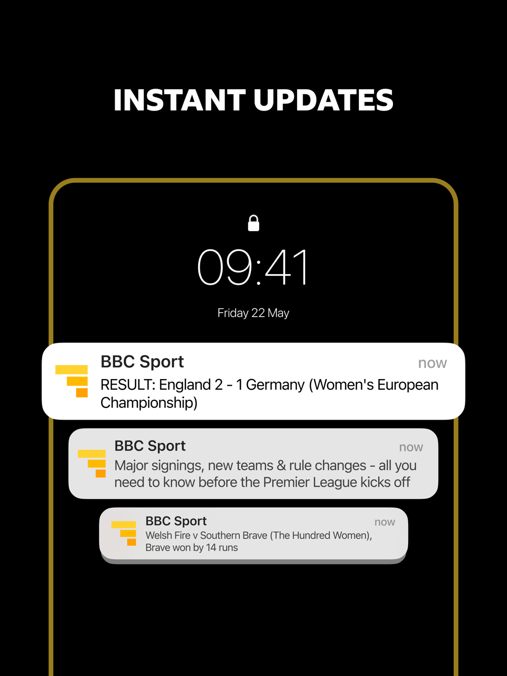 Receive personalised notifications that get delivered directly to your locked screen. Set notifications for top sports stories, plus more than 400 football teams, dozens of cricket and rugby teams and every Formula 1 race!