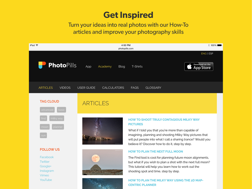 Our goal is not only to help you plan your shots, but also to help you nail them. Whenever you need help, take a look at our How-To articles and videos, join our free online courses or just contact us!