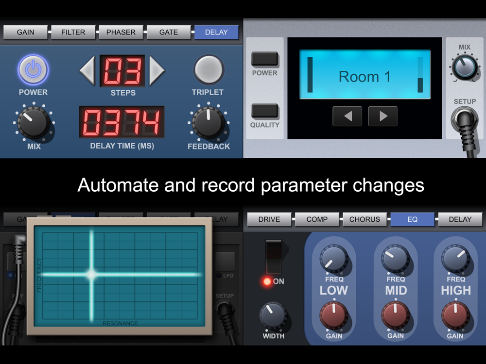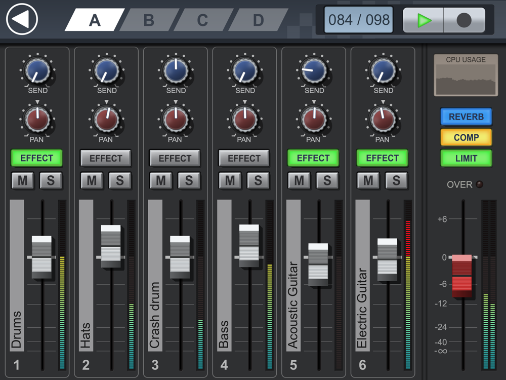 - Add up to 5 Insert effects (Overdrive, Bit Crusher, Compressor, EQ, Filter, Chorus/Flanger, Phaser, Trance Gate, Delay) to each track, and a single Reverb Send effect.