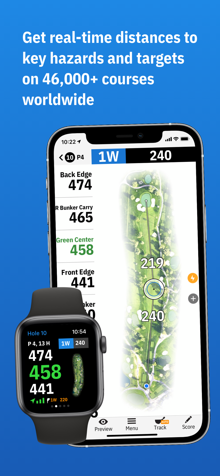 Enjoy real-time distances to the green, hazards, and targets on over 47,000 courses worldwide along with rich scoring, tee times, detailed statistics, entire course flyover previews, and club recommendations.