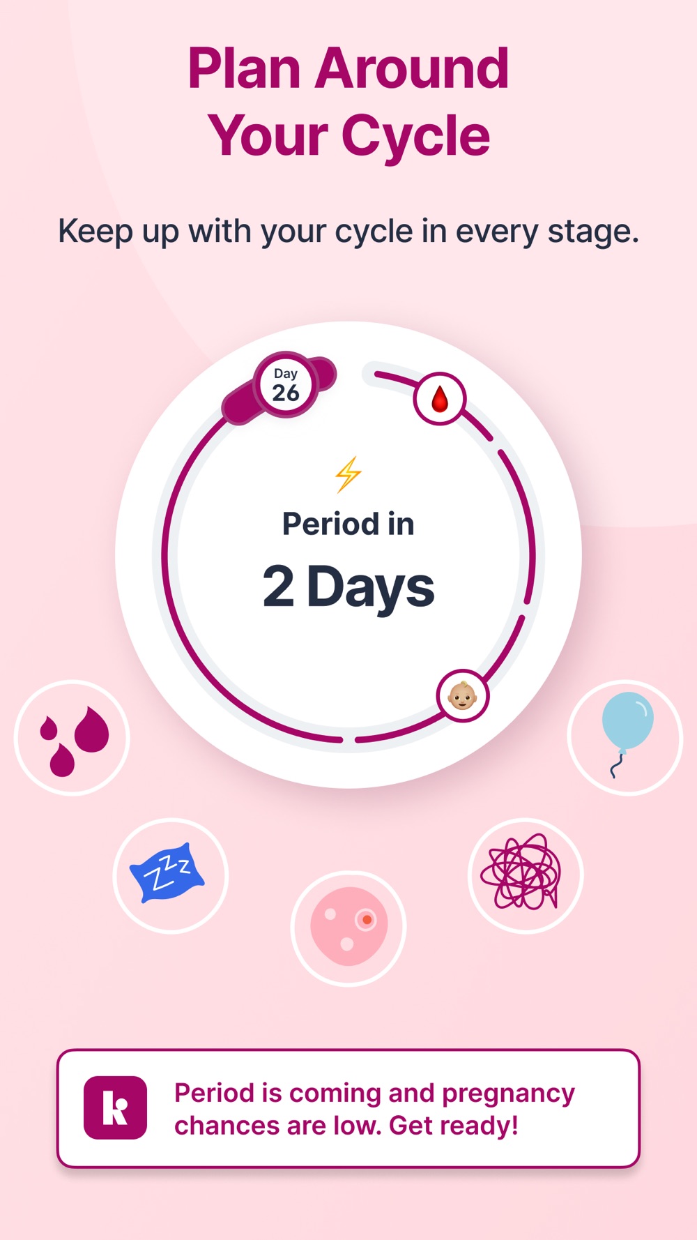 Plan your life with peace of mind—Kompanion Period Tracker got your back. With our period and ovulation calendar’s high prediction ability on the important days of your cycle, there’s no room for surprises. Get reminders on period start and ovulation days, whether you’d like to track your period or track your fertile window to get pregnant.