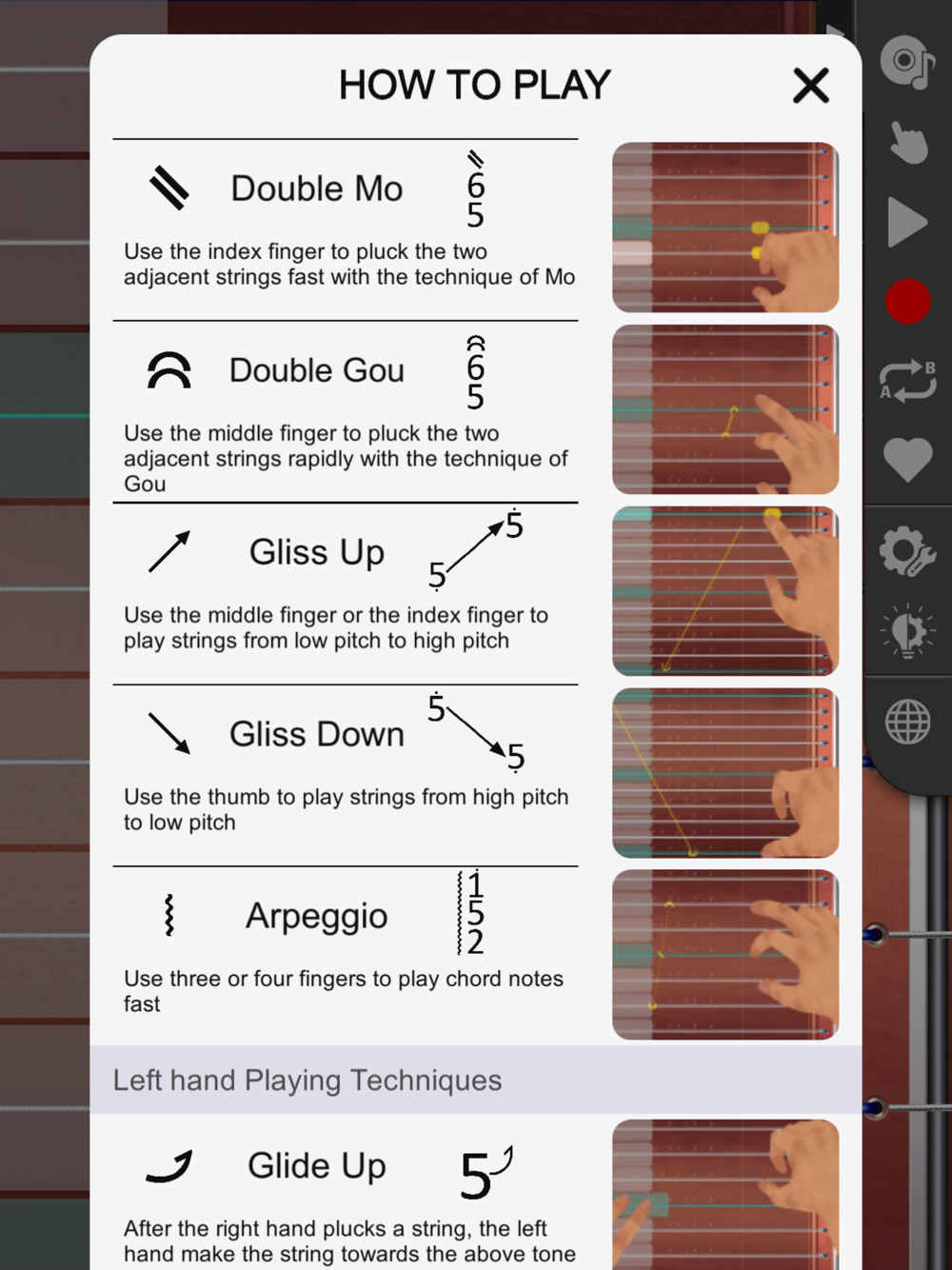 - Playing techniques for Right Hand: Pluck, Gliss, Tremolo(Shake/摇指) / Automatic Tremolo, Overtone.