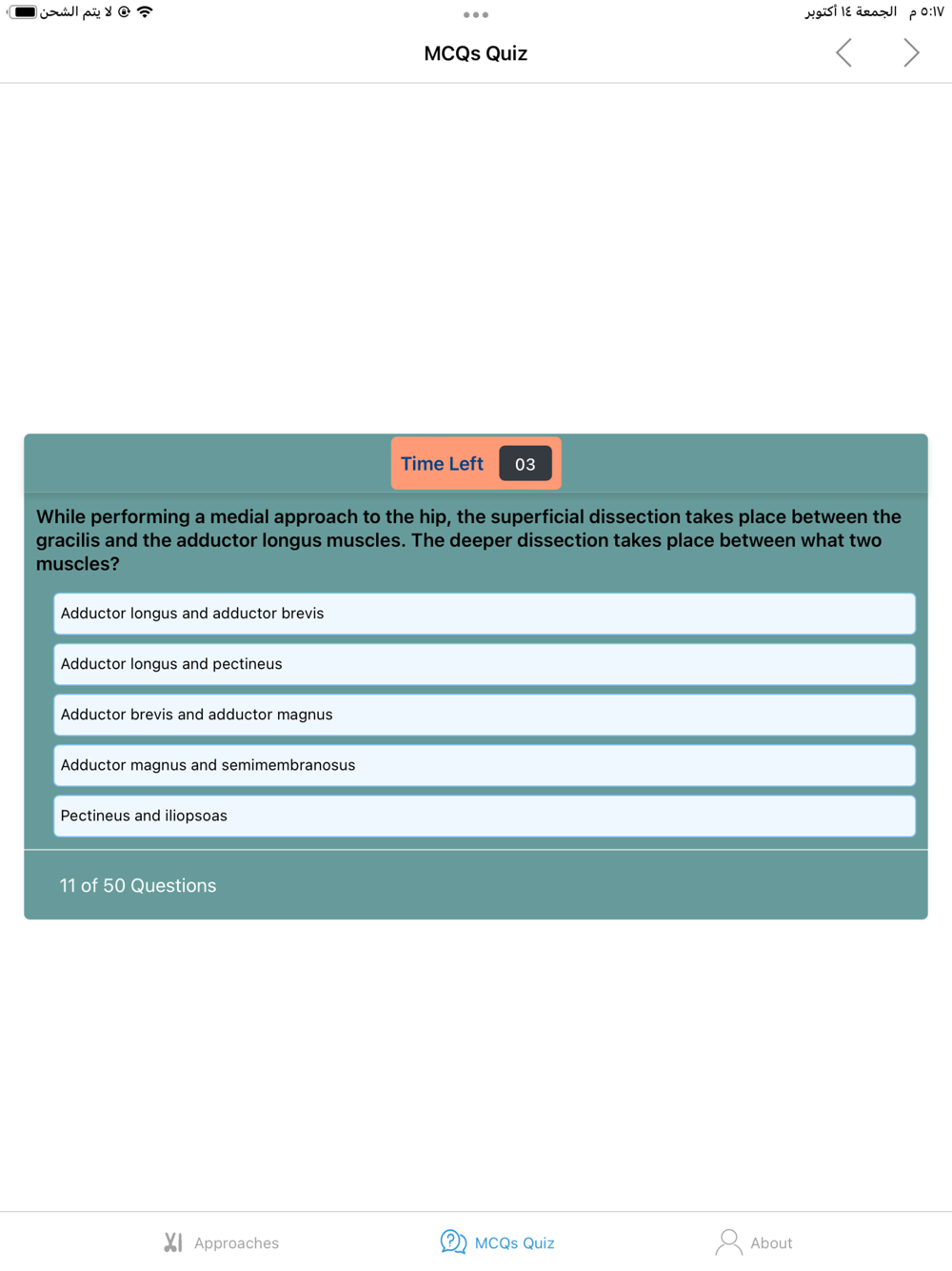 There is also a MCQs quiz test for surgical approaches that contains almost 200 MCQs, the total MCQs in a single quiz are 50 MCQs.