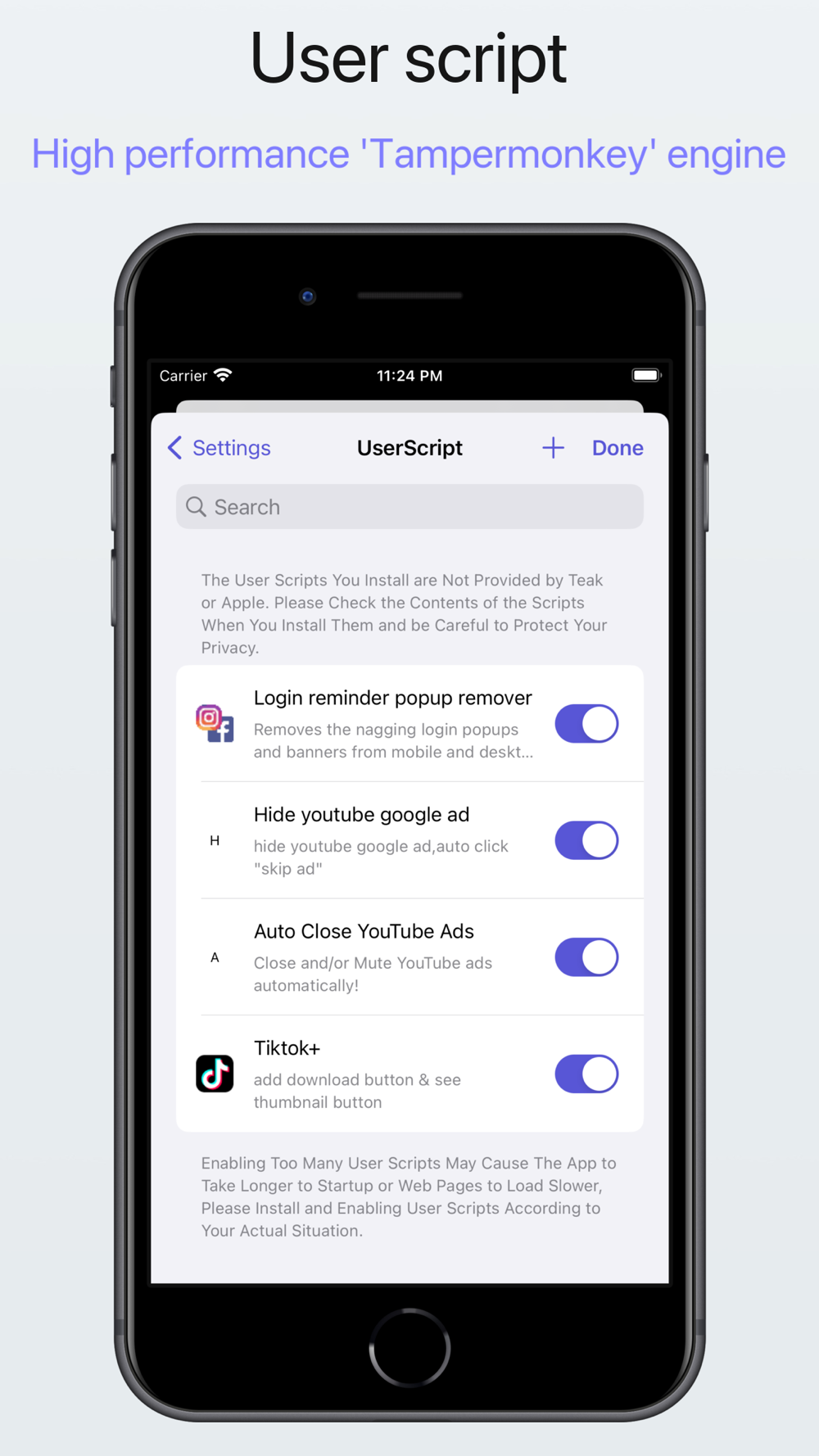 • User script support, compatible with Tampermonkey and Violentmonkey