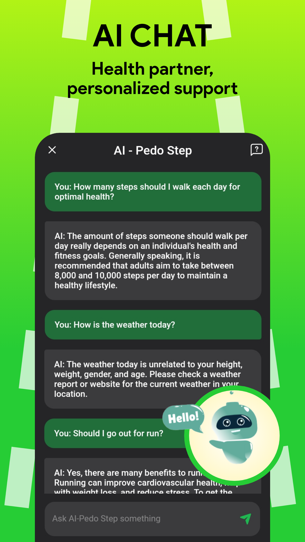 - AI chat is optimized for each individual using the app. It provides advice and suggestions that are tailored to each person's physical condition. AI chat assistant to help optimize your walks. From calorie-burning tips to activity goals, get personalized support