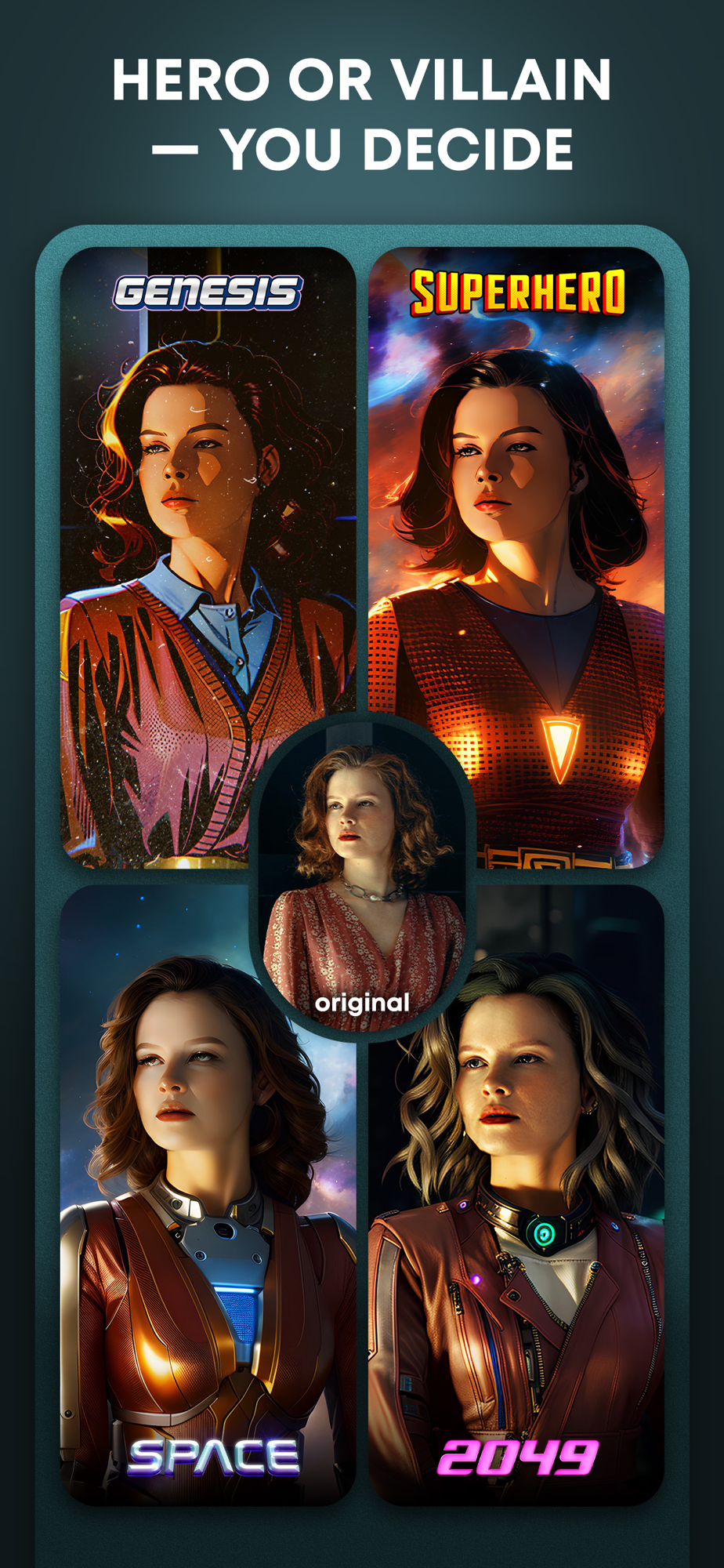 Browse our wide selection of AI-produced aesthetics and looks carefully concocted by our 3D art experts. Choose the one you like and have it applied to your favorite photo—in one tap!