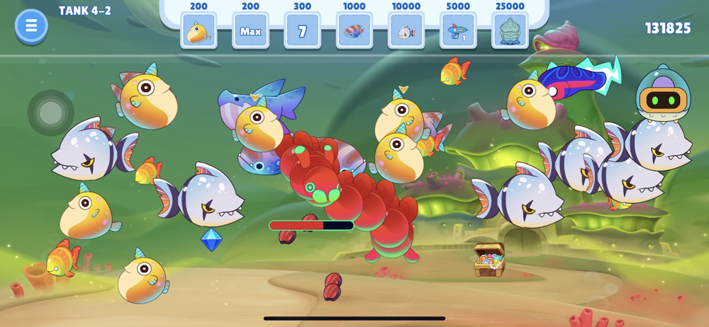 - Adventure: In this mode, at each round the player will be given a few guppies, raised to grow so that they spawn coins or diamonds. To finish a round, we must buy 3 pieces of an egg. The egg will hatch a special creature, which can help the player in later rounds. Players also have to fight monsters to protect the fish by using lasers and shooting them in the head.