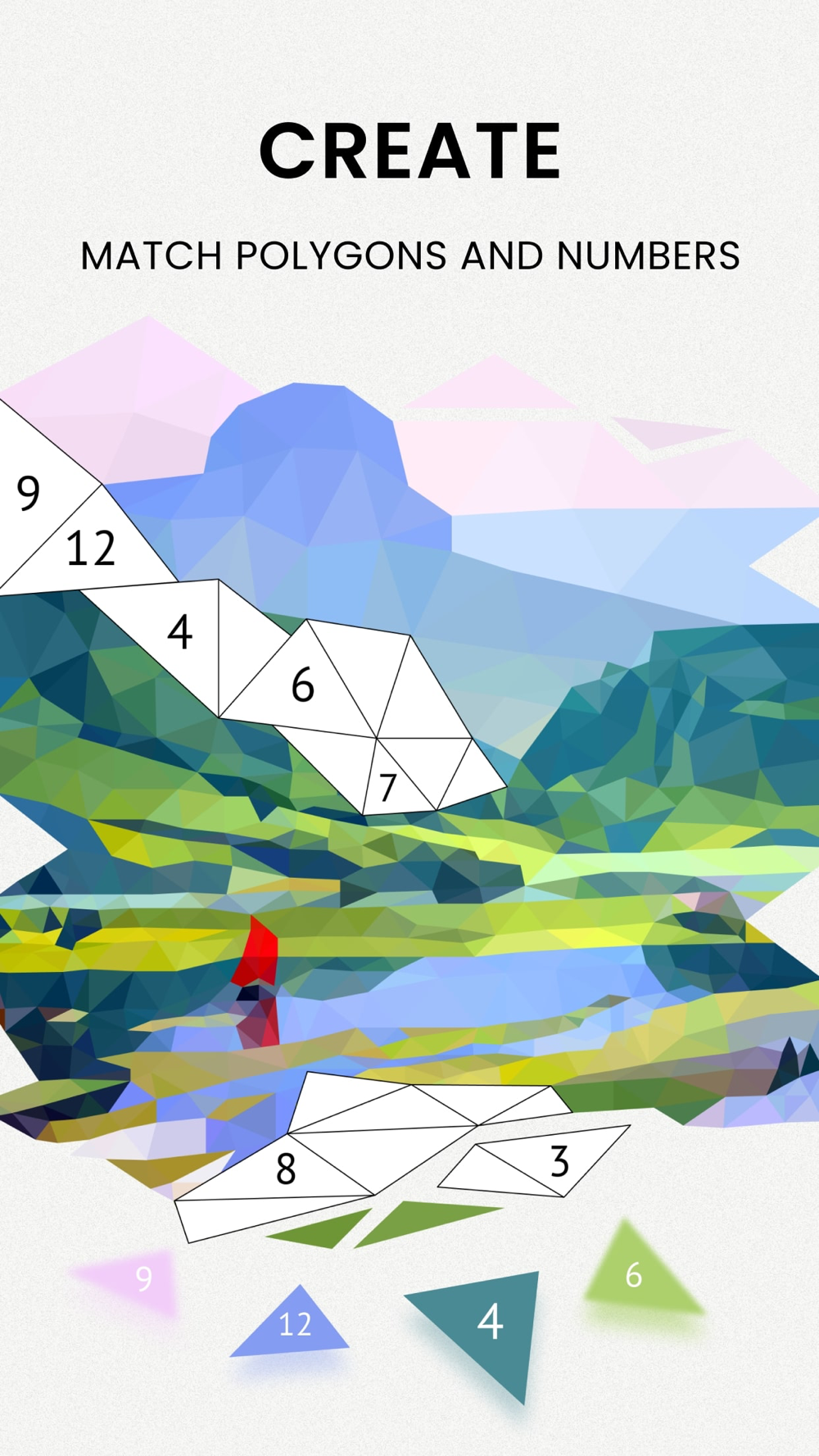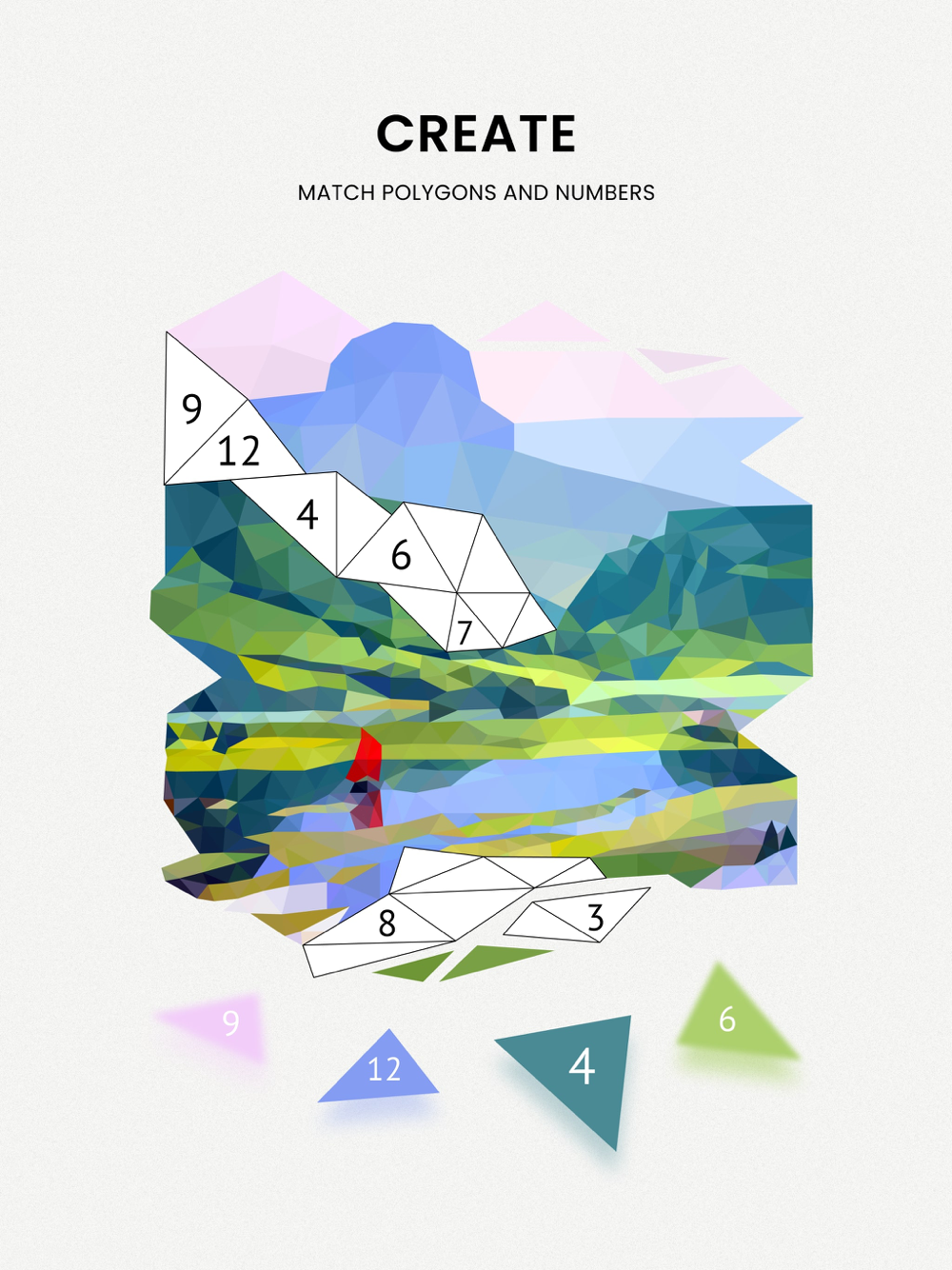 Fix in the polygons into the right number boxes and you will see a funny poly panda, a bright parrot or an unreal unicorn.