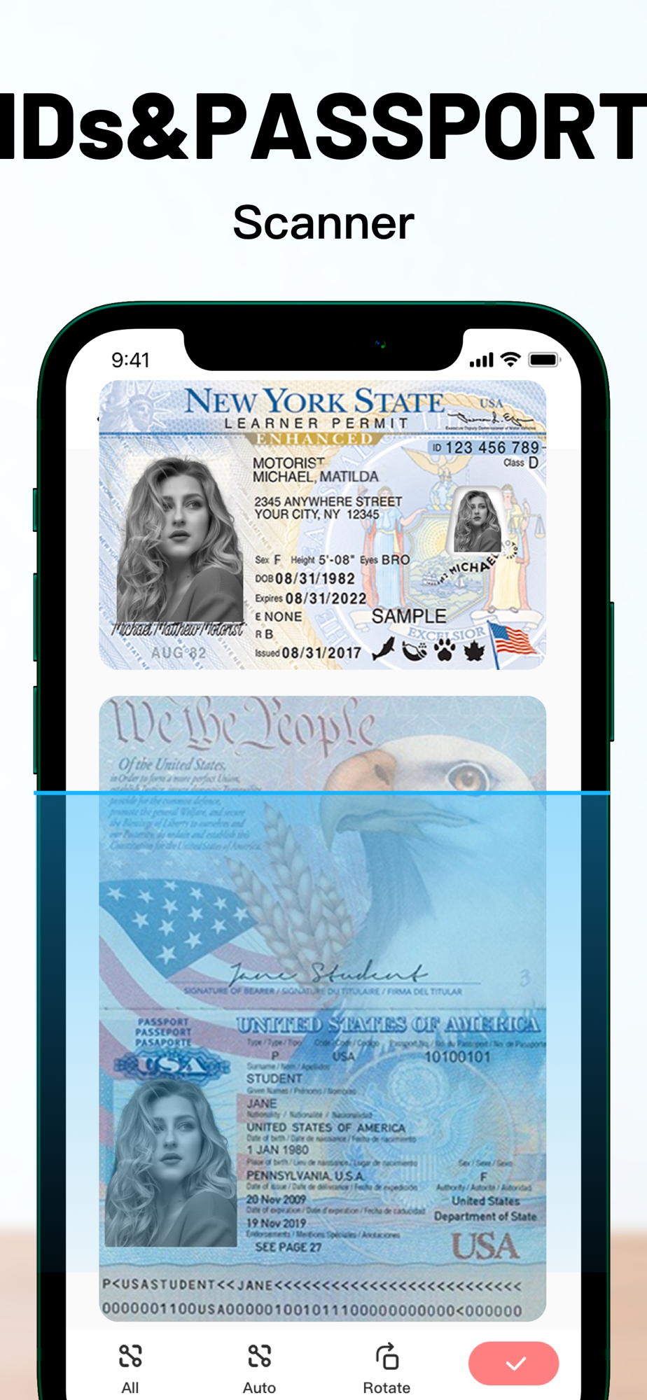 iScan scans ID cards, passports, driver's licenses, visas, work permits and other identification documents in seconds and saves them to your device in image or PDF format using the ID scanner.