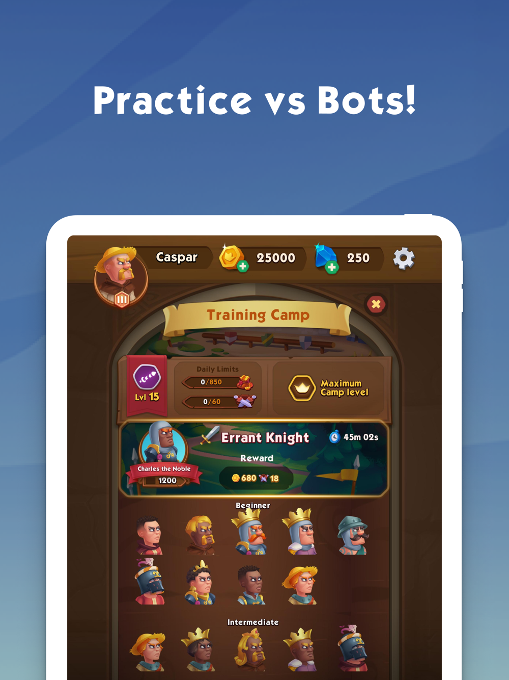 Play and practice chess in a fun, medieval setting, as you upgrade sections of your Kingdom that represent different activities you can do. Earn gold, swords, and scrolls filled with chess wisdom! Get new Gear from the shop. Each victory helps restore your Kingdom’s magnificence and prosperity!