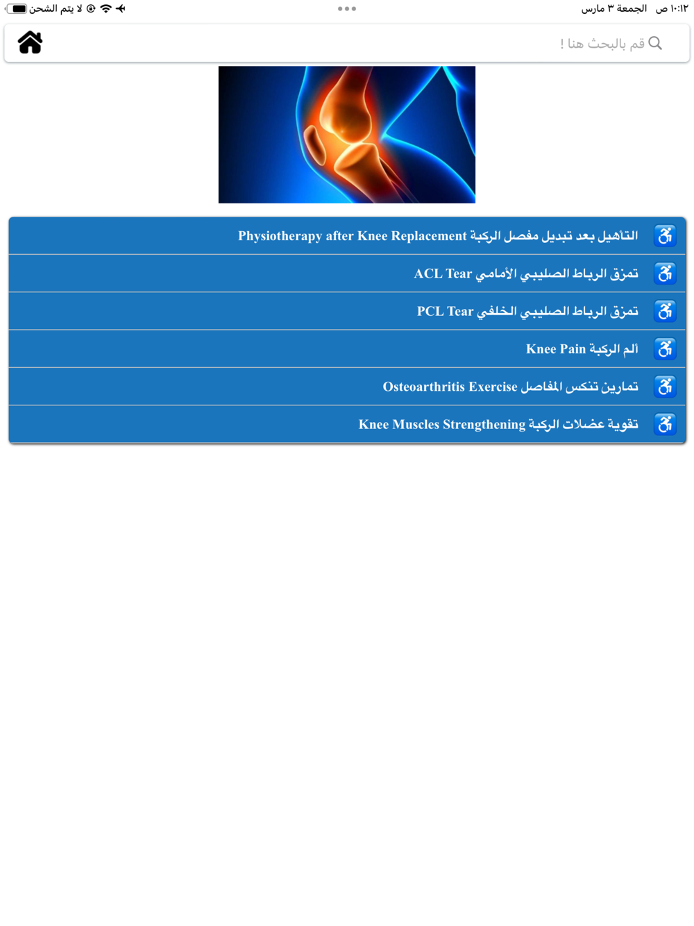 تم تقسيم التطبيق بحسب المفصل, ثم بحسب كل حالة مرضية, وكل حالة تم ارفاق مقطع فيديو لشرح طريقة العلاج الفيزيائي وإغادة التأهيل بالاضافة لإرفاق مقالة شرح عن هذه الحالة المرضية.