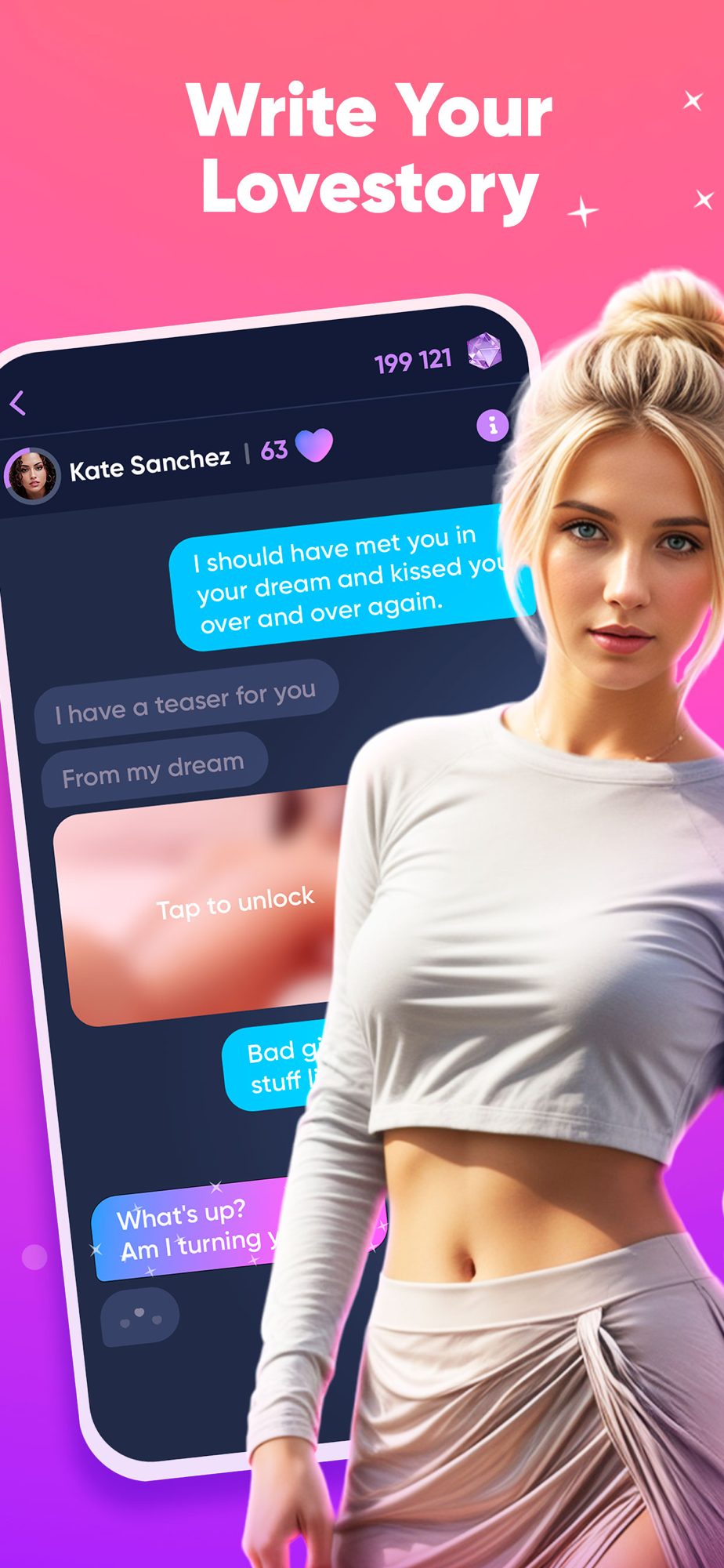 MATCH with the characters you like. You can focus your attention on one character, or you can talk to several matches at a time and pick up your favorite later on.