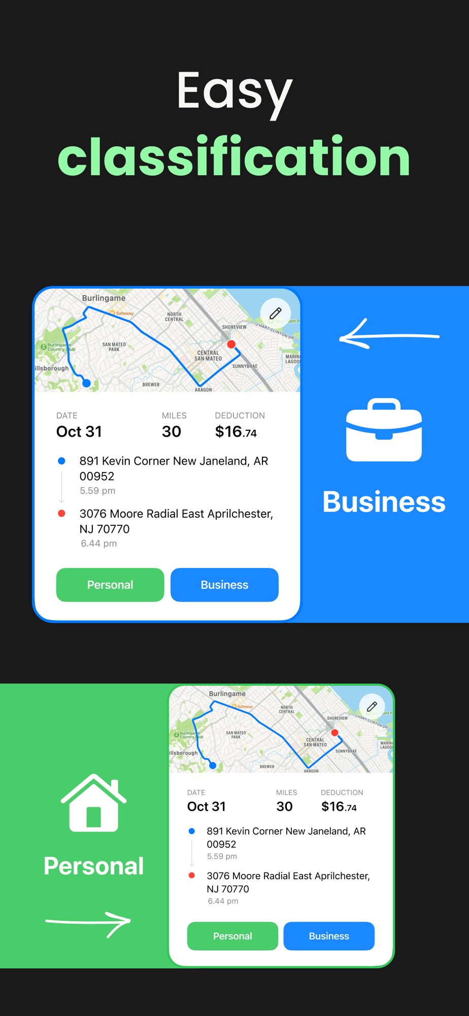 Intuitive Drive Categorization: Simplify the process of classifying your drives with Tofu Mileage's intuitive swipe feature. Easily distinguish between business and personal trips by swiping right or left, enabling accurate mileage tracking. The app's user-friendly interface ensures that your mileage log remains organized and tax-compliant.