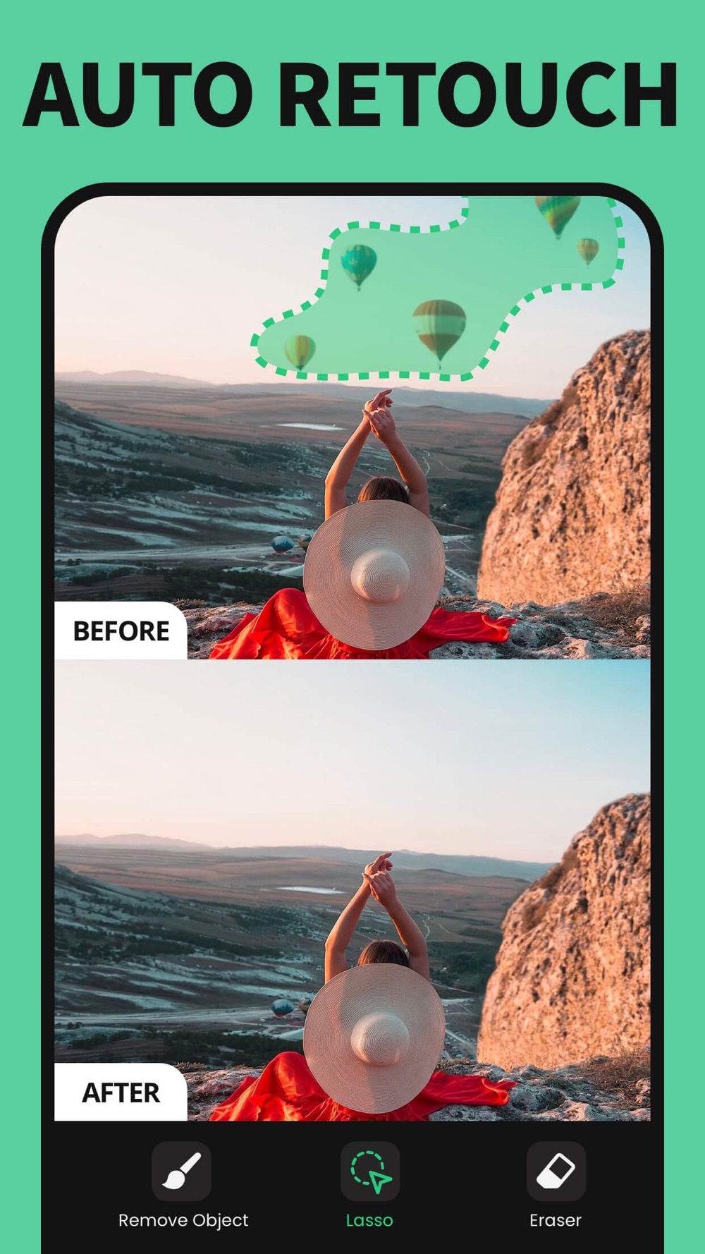 Tired of dealing with photobombers or messy backgrounds? Allow us to be your trusted photo cleaner at hand. Simply brush over the unwanted objects or try the hands-free Auto mode for automatic detection & removal. Watch as all those undesired elements vanish in seconds.