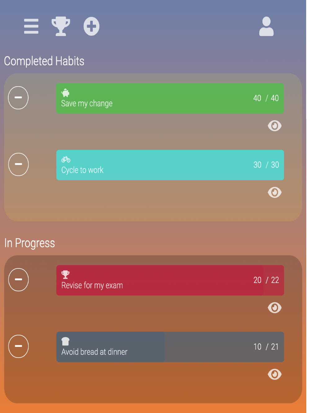 Visualise your progress on your personal achievement wall, a motivating display of your journey towards your goals. Watch your wall fill up with achievements as you consistently meet your daily habits.