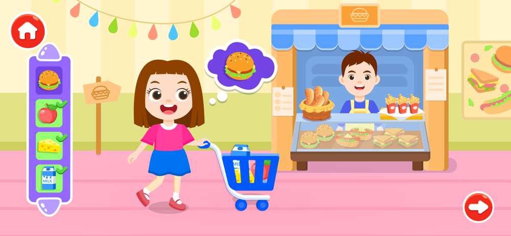 In kids games let your kid put his things in a luggage storage so that they do not interfere with his baby shopping. Fill a shopping basket with necessary goods following a shoppinglist generated by the baby games. Go shopping to the fast-food department and cook a tasty dessert. Go to a cash register and try to pay for made purchases!