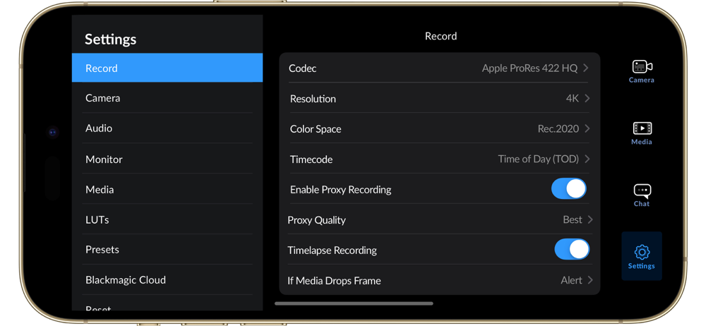 The settings tab unlocks the full power of your phone’s camera, with quick access to advanced settings such as monitoring, audio, camera setup, recording and more! The record tab gives you total control over video resolution and recording format including industry standard Apple ProRes or space efficient H.264 and H.265. Plus, you can set anamorphic de-squeeze and lens correction settings. Professional audio options include AAC and PCM format and VU or PPM audio metering. You can even add external microphones! Or add 3D LUTs to recreate film looks!
