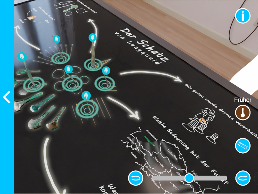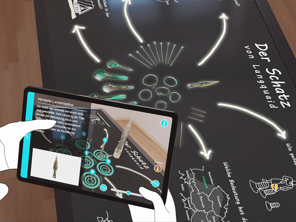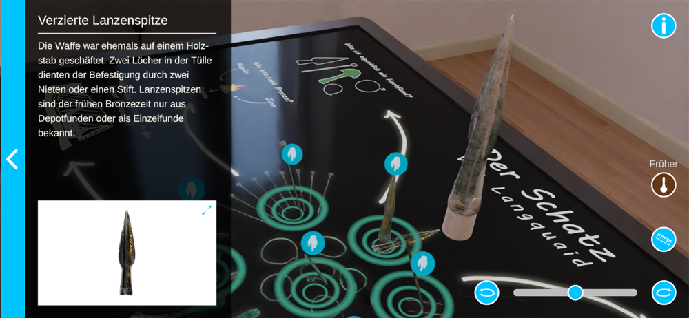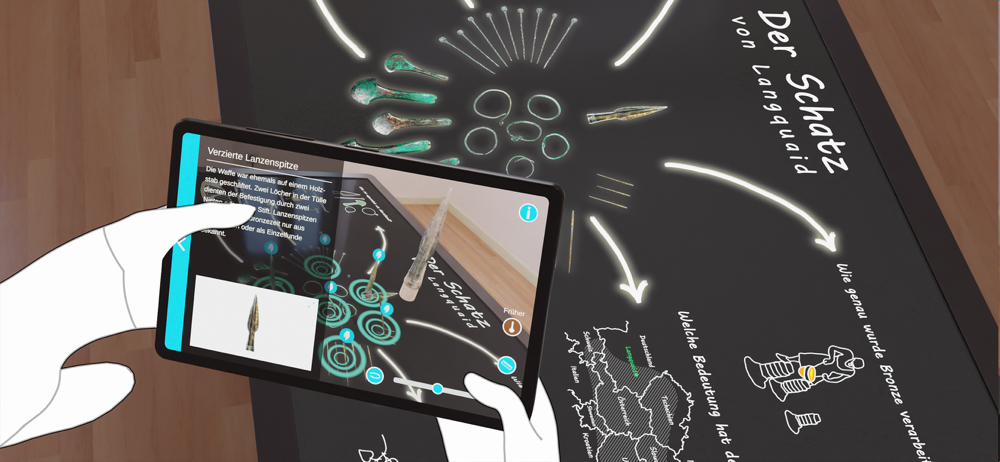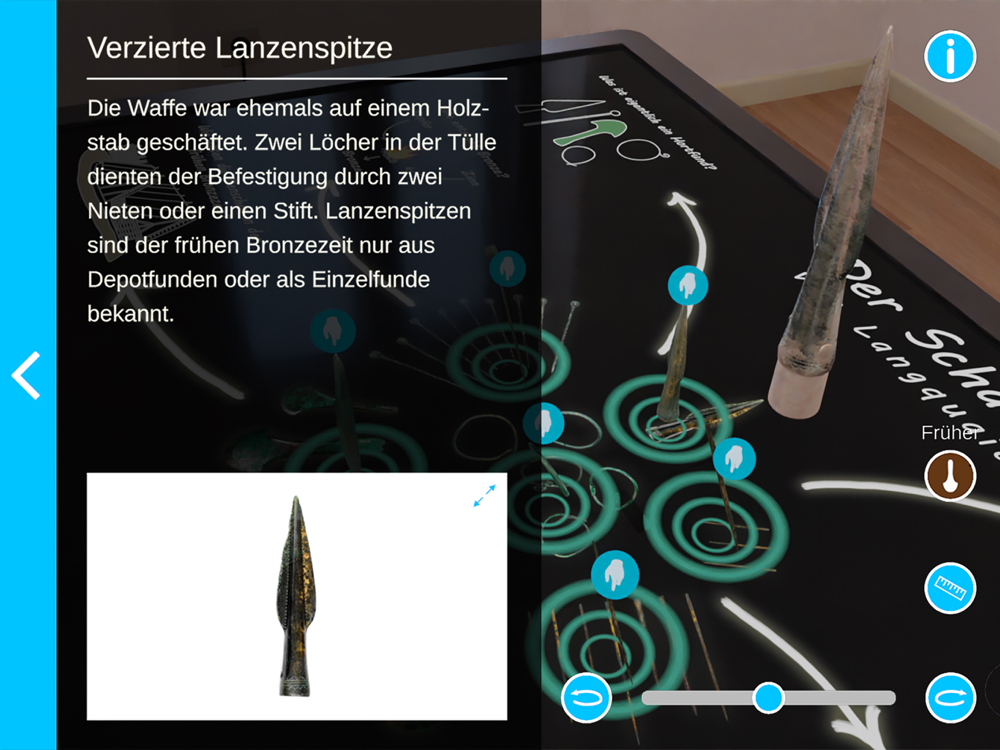 Dank Augmented Reality ermöglicht die App einen unkomplizierten, interaktiven und berührungslosen Umgang mit den Fundobjekten, ohne die Originale zu gefährden. Ob Sie die filigranen Gravierungen einer Speerspitze studieren oder lernen möchten, wie die Beilklingen mit dem Holzgriff befestigt wurden – die App liefert Ihnen diese Details.