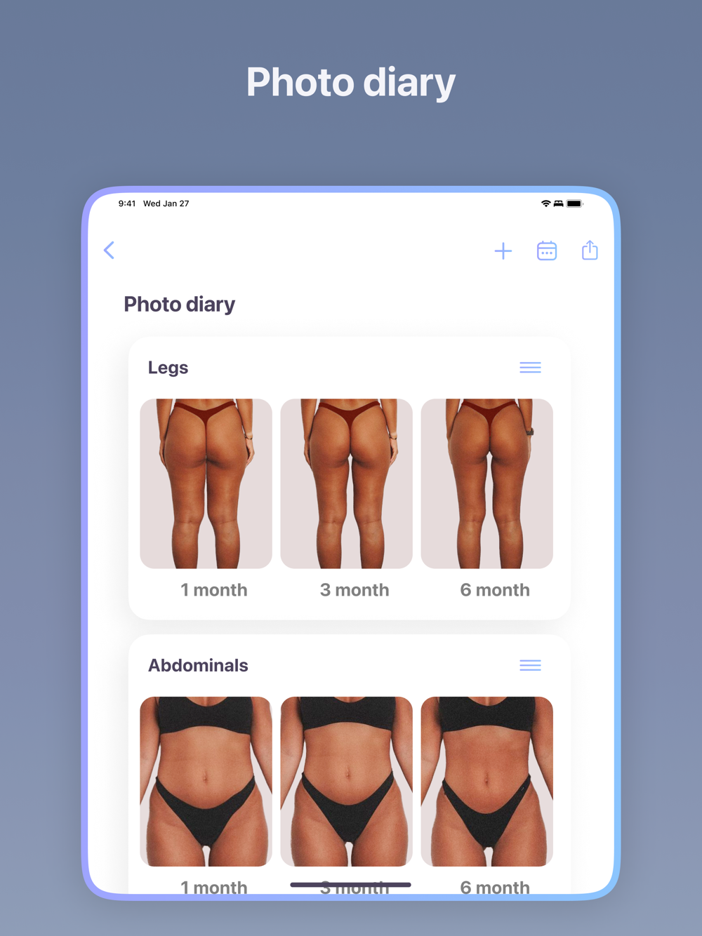 The app has a workout plan for all muscle groups. We will work on abs, legs, chest, glutes and more. You can track your total progress by vieng workout history, a photo diary to motivate yourself, and body metrics;