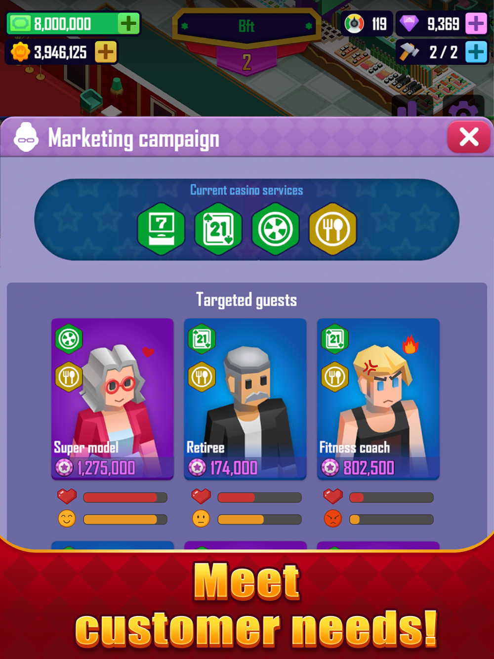 As the manager of Vegas Resort, you will also need to make many decisions to help grow the business. You will need to decide how to run effective marketing campaigns, target different types of customers, run different games and social media campaigns, and participate in various popular tournaments to increase the visibility of the casino. You also need to decide how to allocate your revenue and reinvest in the casino, you can choose to upgrade your equipment, upgrade your decoration or upgrade your staff training to serve your customers better to get the most out of your profits!