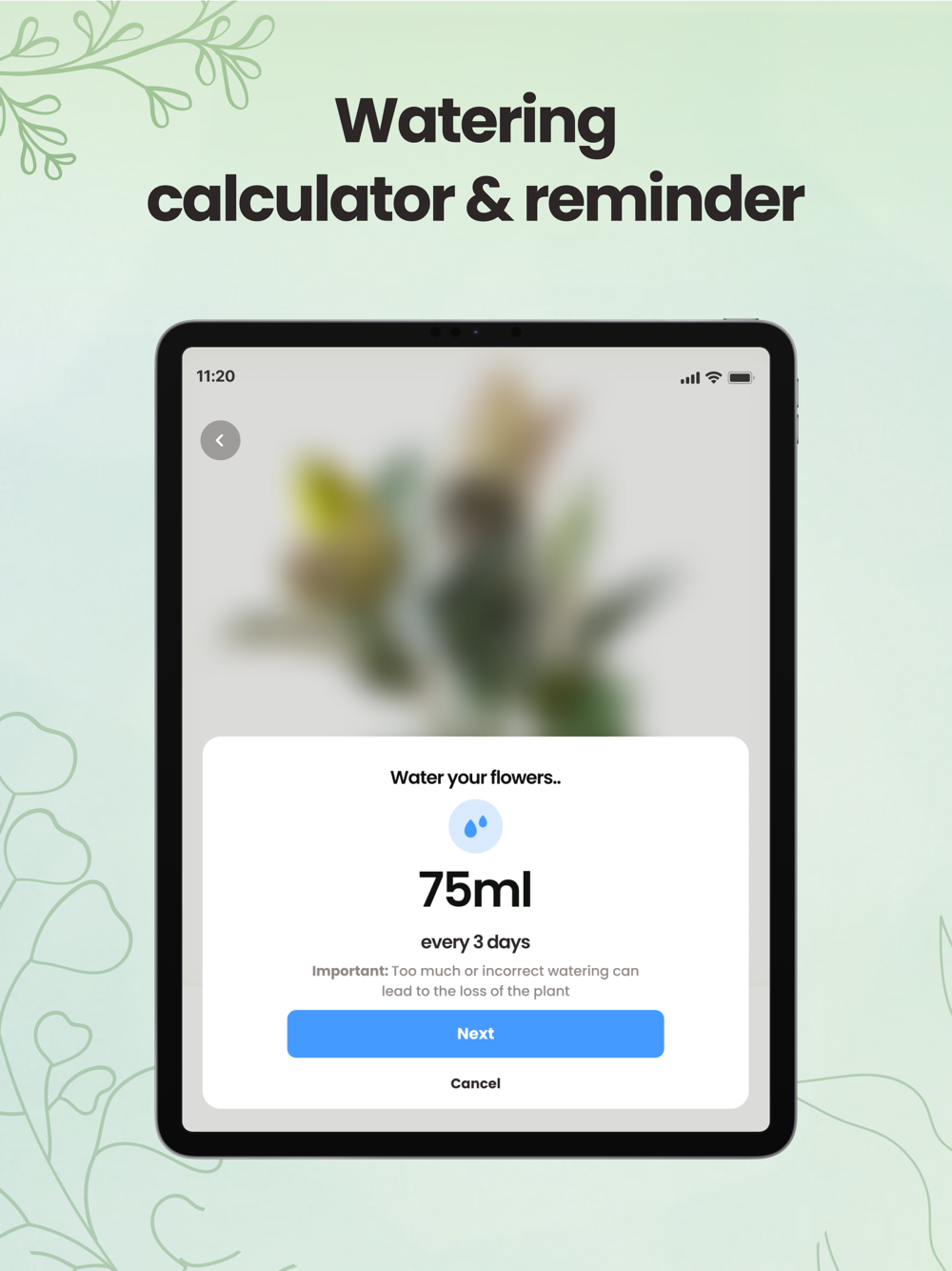 Through our app's features, you'll be able to identify the plant in front of you, determine the ideal watering schedule for your flowers, access proper care plans, and understand the reasons behind dry leaves on your plants.