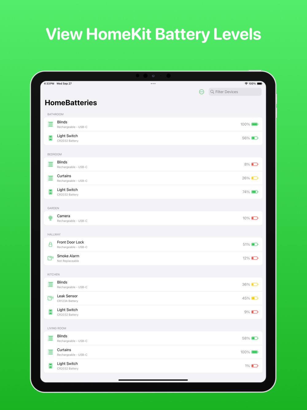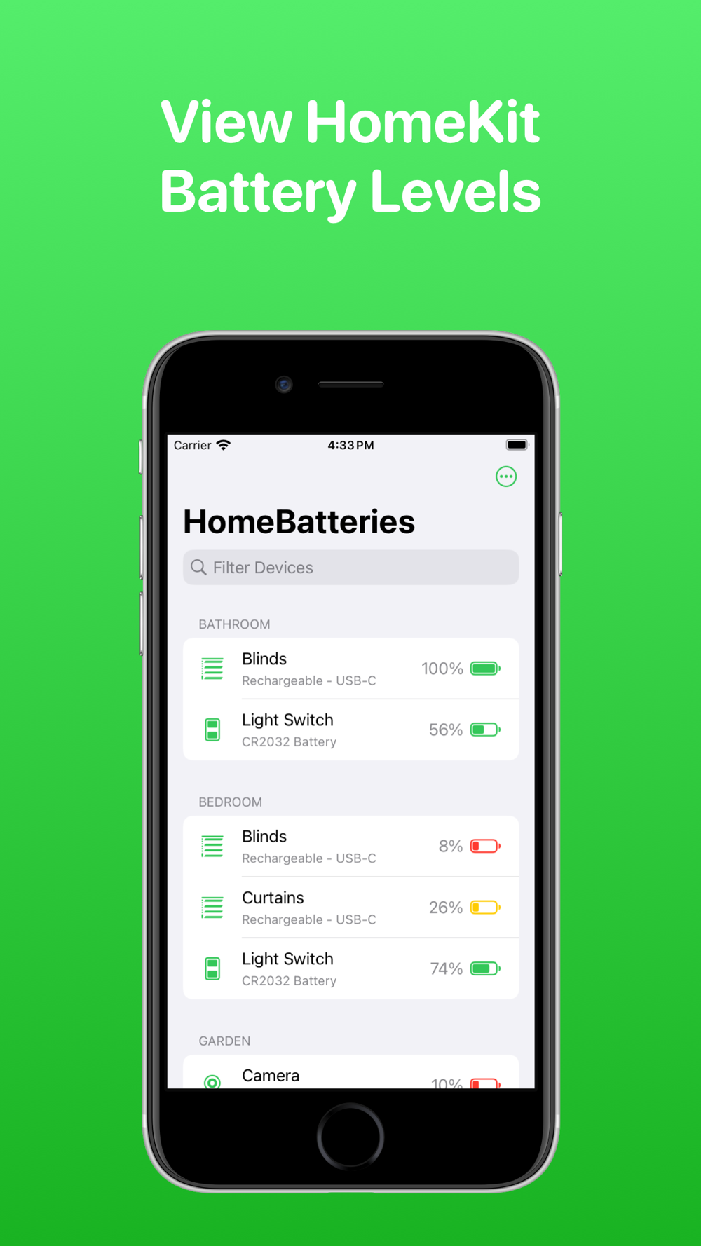 If you have ever been in the situation where your battery powered HomeKit device has stopped working, then HomeBatteries can help prevent it from happening again! You can view all of your HomeKit device battery levels in one place without having to go through each accessory individually from the Home app.