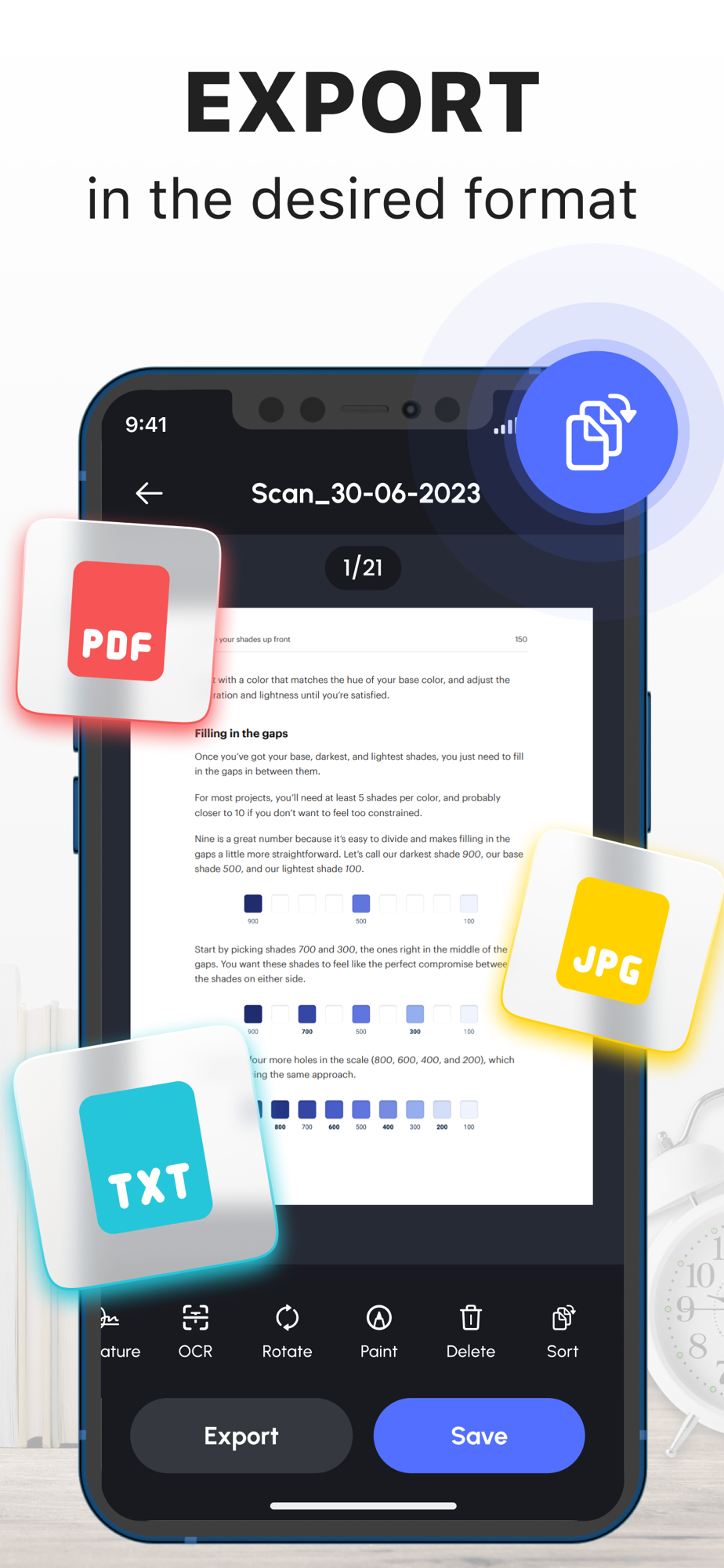 Need to convert files into different formats? Scanner has got you covered. Whether you want to convert your files to PDF, TXT, or JPG, the app offers a seamless conversion process, ensuring compatibility and flexibility with your preferred file formats.