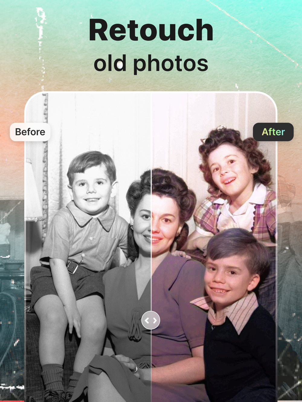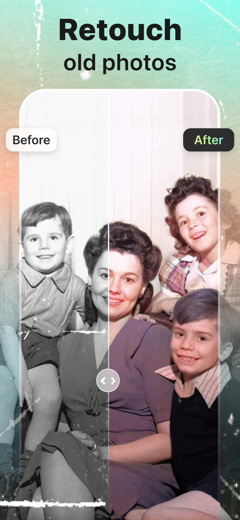 Retoucher - an AI-powered photo editor with many features for your picture: image sharpening, black and white photo colorization, old photo restoration, background editing, magic eraser, and a variety of captivating photo filters.
