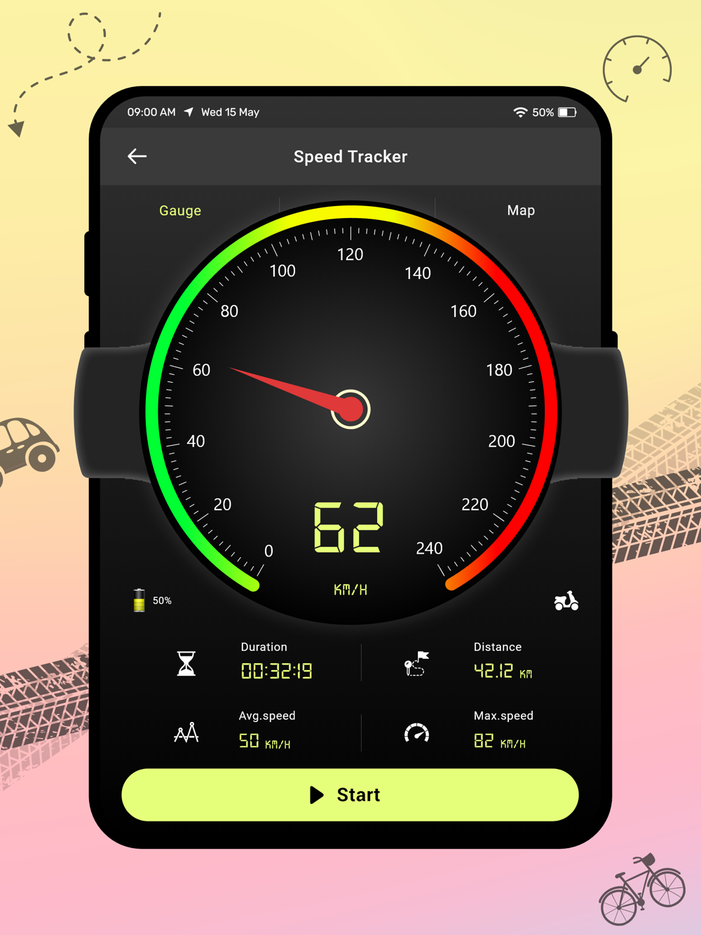 ⇒ Gps speedometer start & end trips, get detailed insights of avg. speed, max speed driven