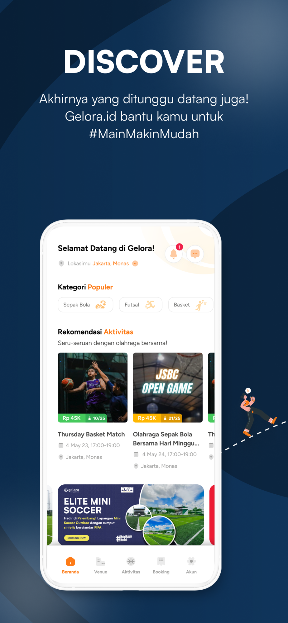 Kami ada untuk kamu #MainMakinMudah. Digital Platform Gelora.id hadir dengan Gelora Activity. Kamu jadi mudah ikut aktivitas olahraga favoritmu! Bersama teman atau sendiri, kamu bisa buat atau ikut komunitas yang tersedia.