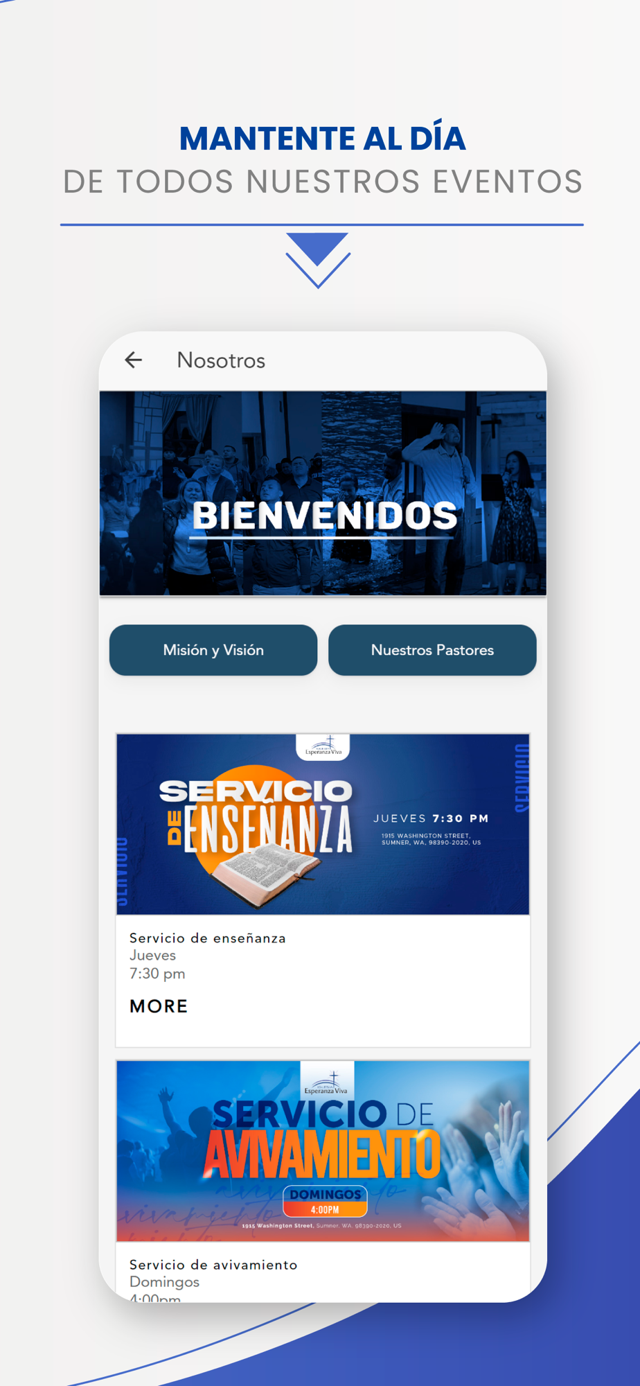 "Accede a la aplicación móvil de Esperanza Viva. Conéctate con ellos vía mobile e internet. Recibe las últimas prédicas, fotos, eventos y noticias de tu iglesia — en cualquier momento y cualquier lugar.