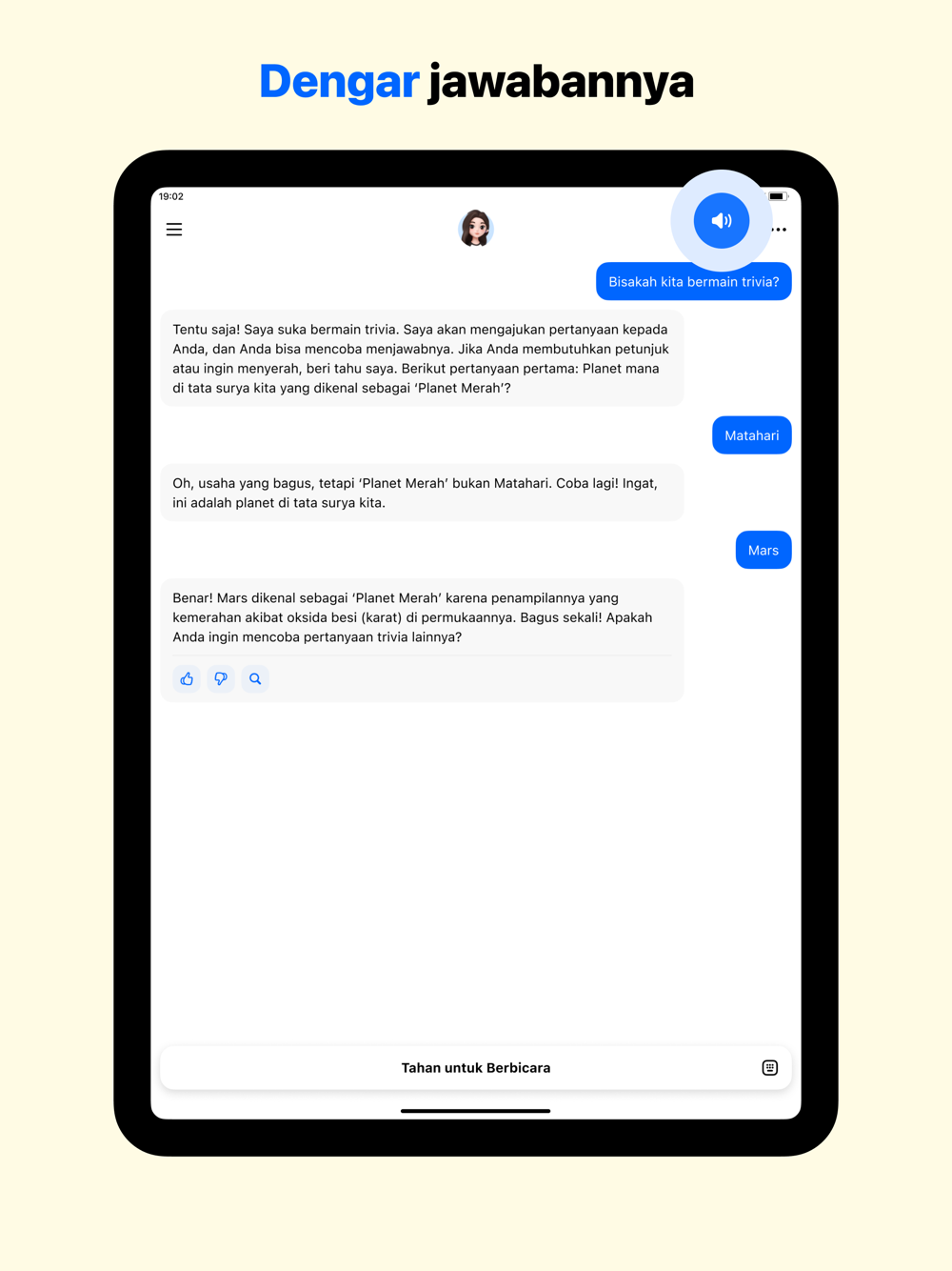 Untuk membuat segalanya lebih mudah, saya telah diberikan fungsi suara. Jangan ragu untuk ngobrol dengan saya seolah-olah saya adalah teman Anda - baik berbicara atau mengetik, mana yang Anda sukai.