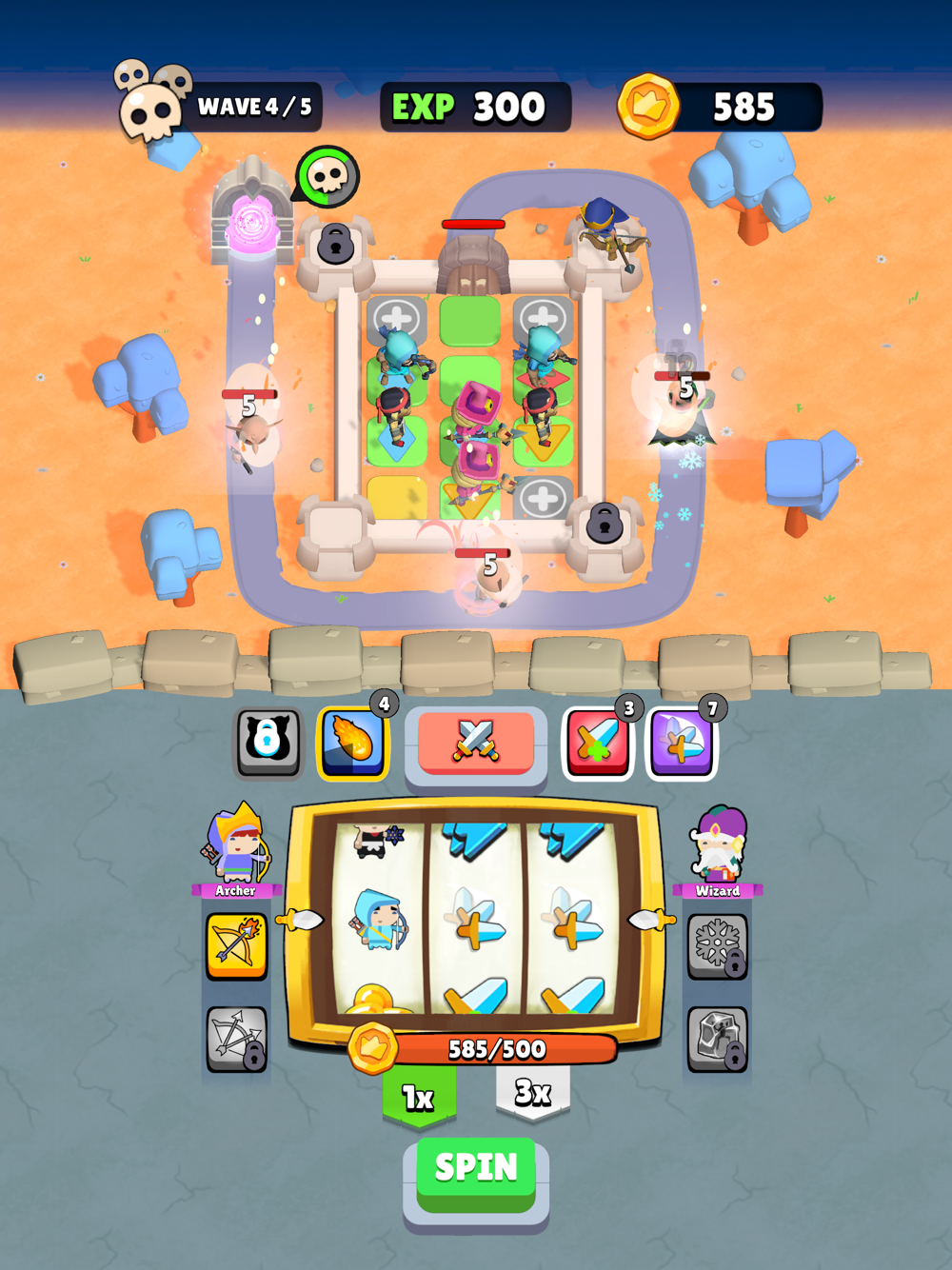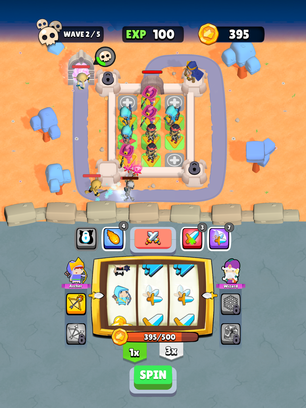 With a unique slot machine mechanic, players win random units and power-ups with every spin. By combining these units, you can create stronger warriors, unlock heroes as the game progresses, and use their special abilities. You will have to defend your castles against the constantly incoming waves of enemies in the game; Waves of enemies will become more challenging over time, which will require constant challenge and strategy changes.