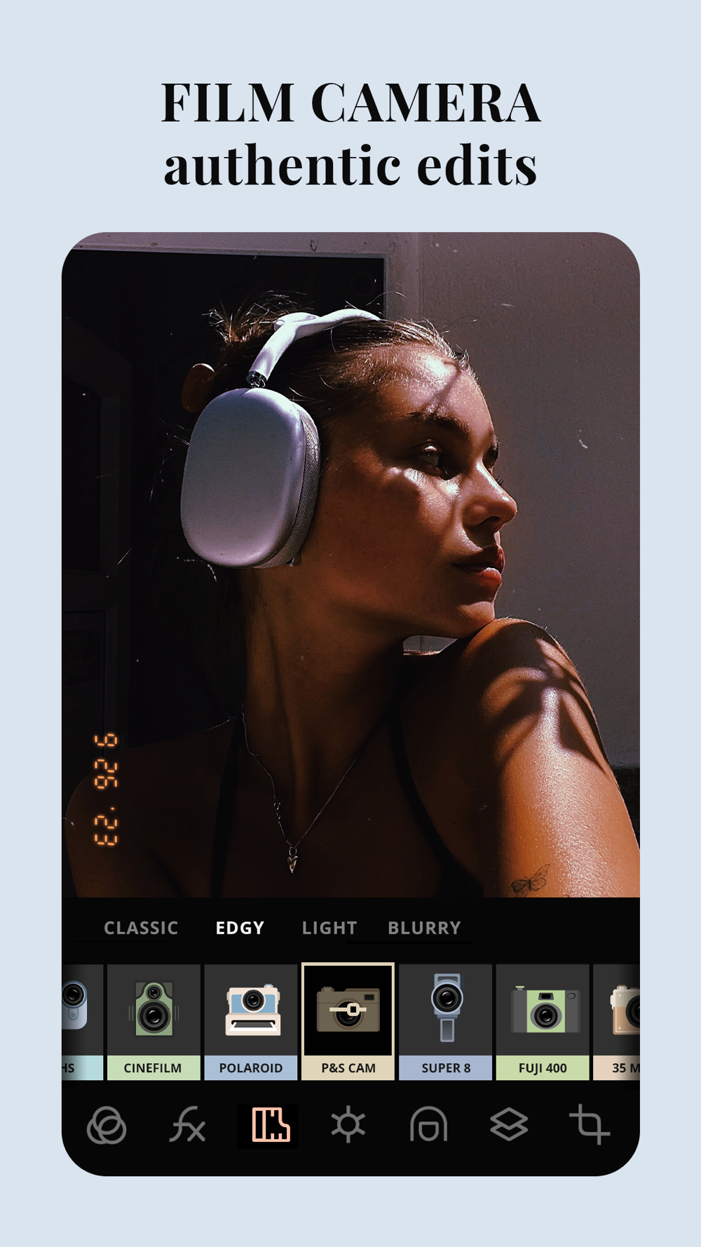 ► FILM EFFECTS: Give photos some extra soul with effects evoking Polaroid, VCR, Kodak, Super8, and Fuji;