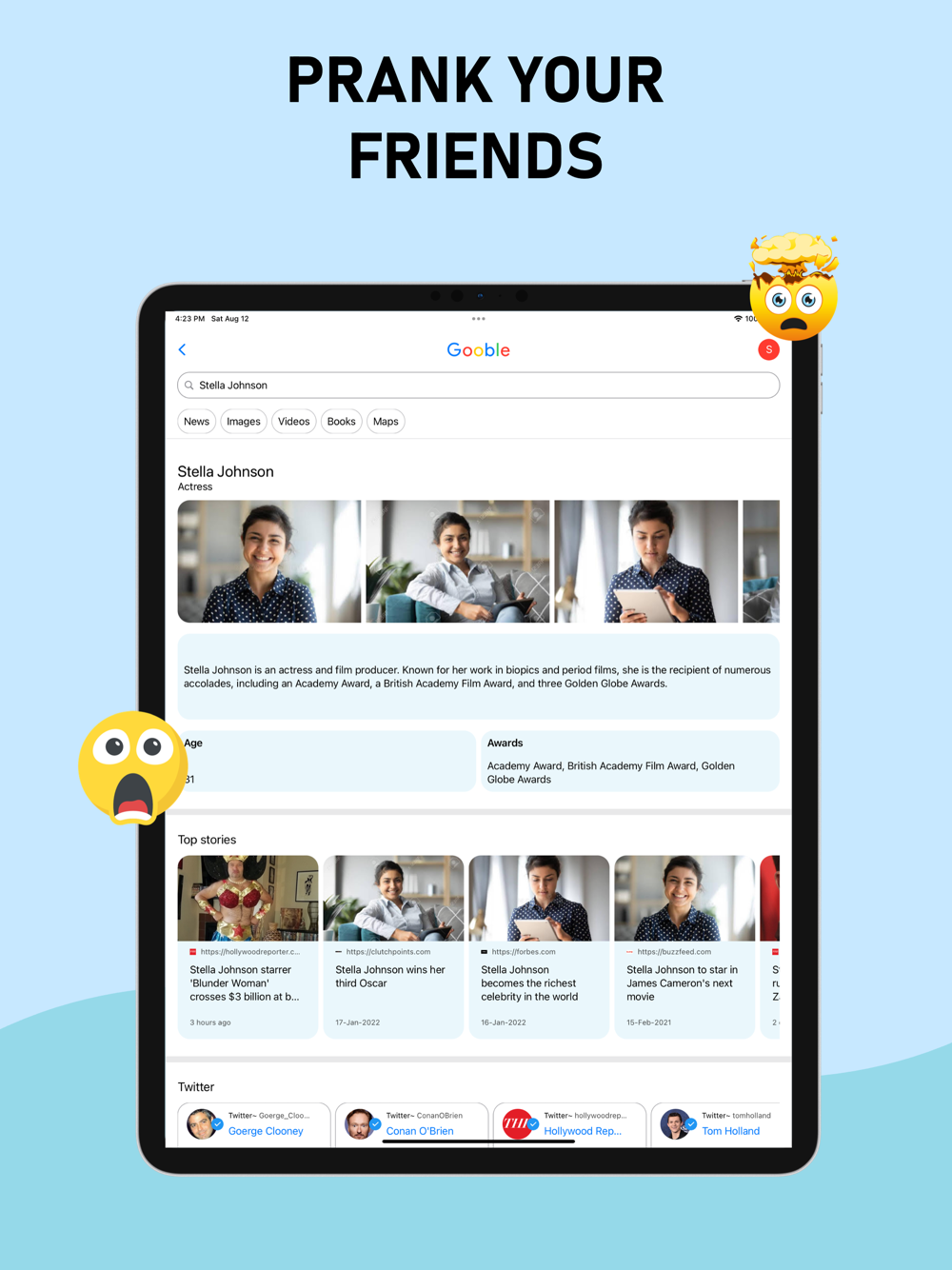 Create fake Google search results for prank and memes. Just enter your name and images and click submit. Read hilarious search results. Prank your friends by sharing their funny search results with them.