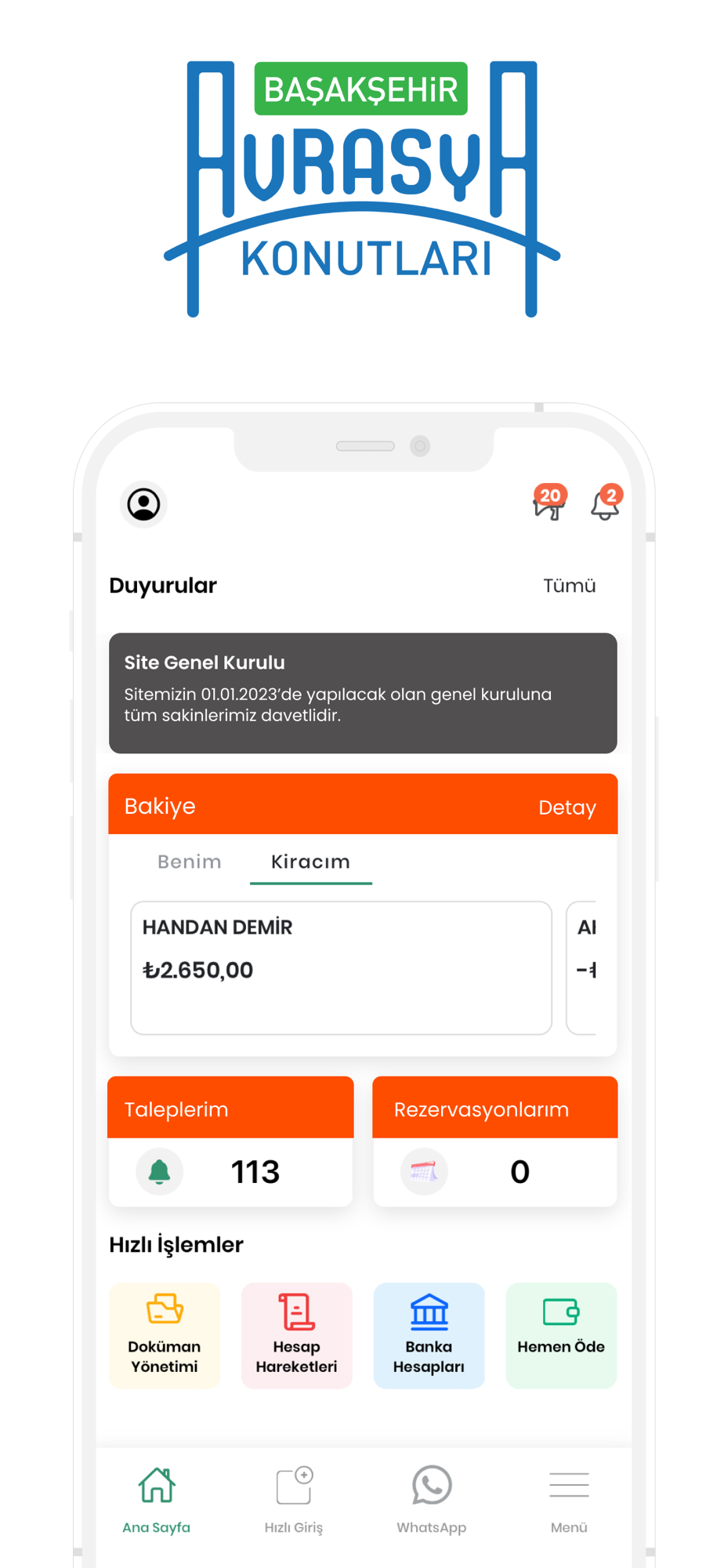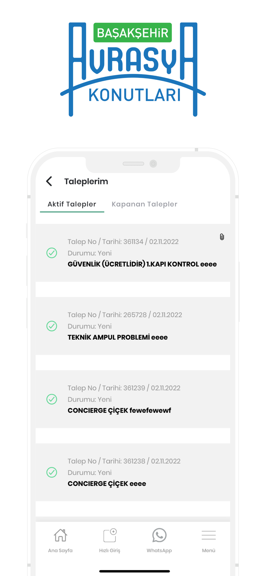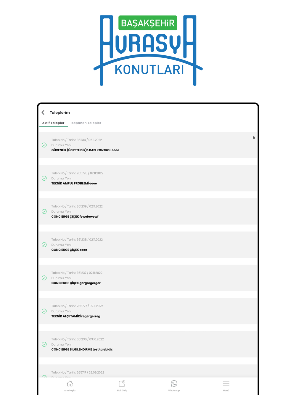 • Taleplerim; Teknik, Güvenlik, Temizlik, Bahçe Bakım vb. hizmetlerinde tespit edilen olumsuz durumların fotoğrafını çekerek iş talebi oluşturma,