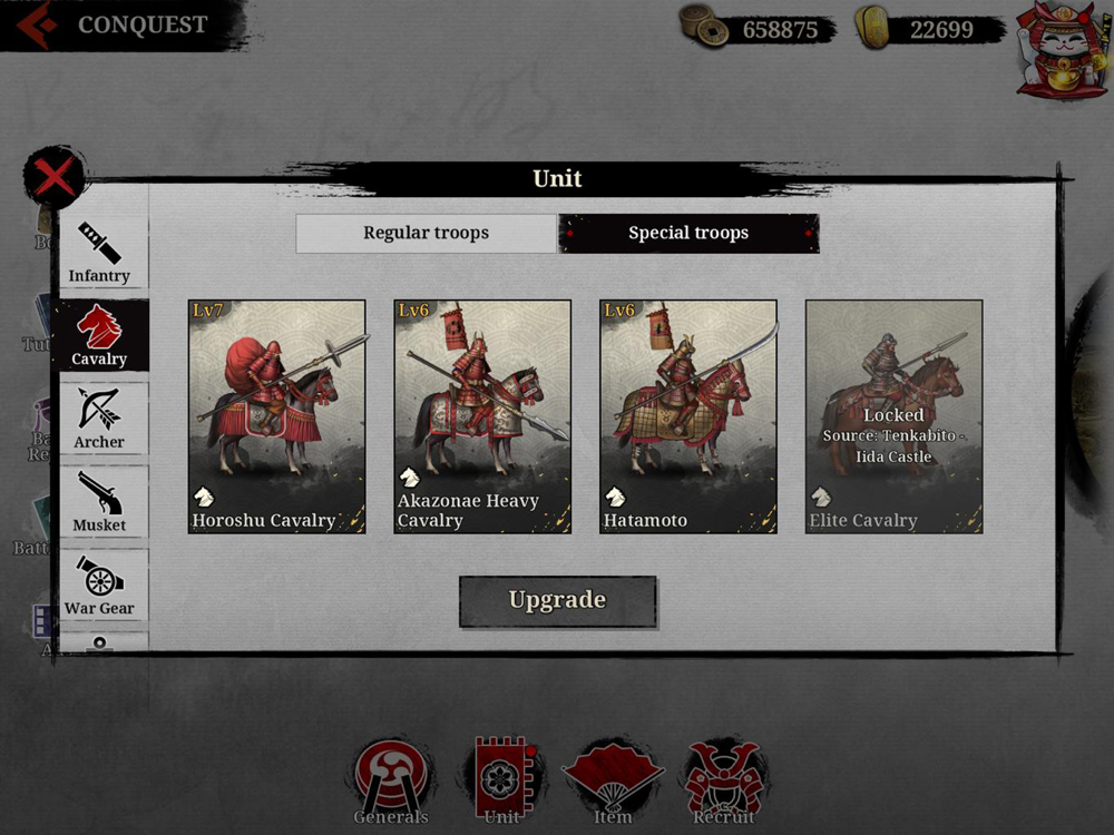 * Infantry, cavalry, archer, musketeer, war gear, ship... a wide variety of unit types allow you to strategize within the command tent and achieve victory a thousand miles apart! There are also special troops with exceptional combat abilities, such as ninjas, sword masters, and Horoshū, ready to be dispatched at any time. Hone your troops on the battlefield as they will gain level upgrades, potentially altering the state of the battlefield!