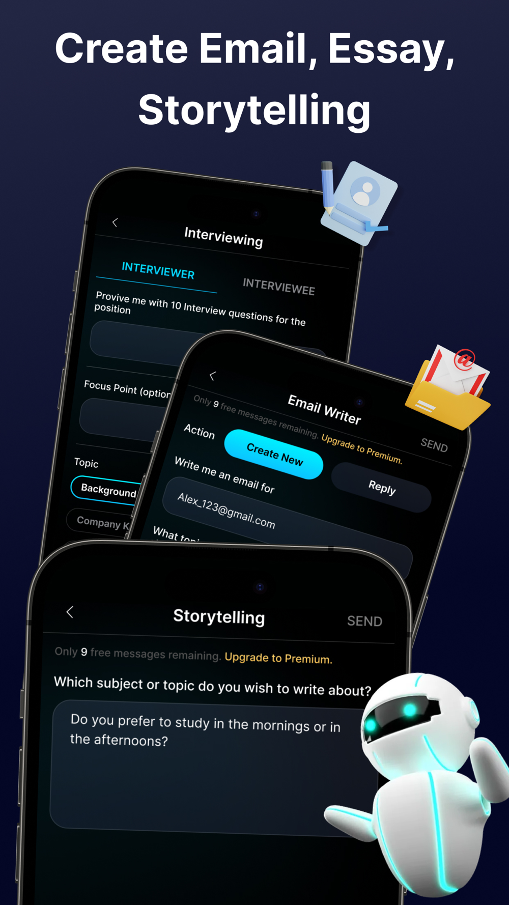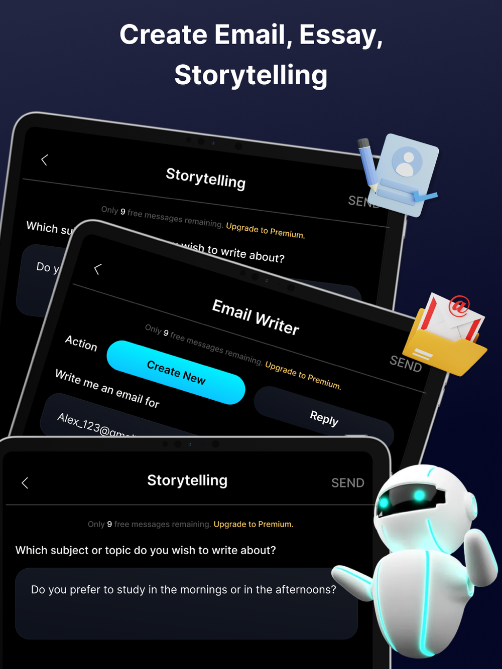 AI ChatBot can write anything you ask for! From academic writing, emails, and social media content to captivating storytelling, witty comedies, and heartfelt lyrics, AI ChatBot‘s creative prowess knows no bounds. You'll be amazed by the natural flow and quality of the text it generates, saving you valuable time and effort.