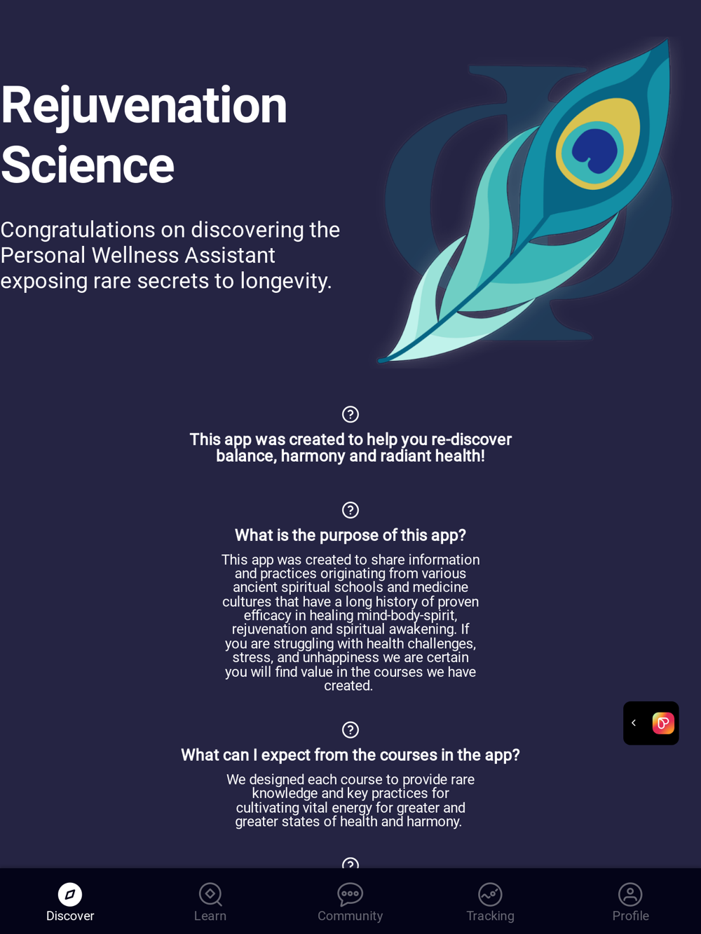 Congratulations on finding the Personal Wellness Assistant exposing rare secrets to longevity. This app was created to help you re-discover balance, harmony, and radiant health!