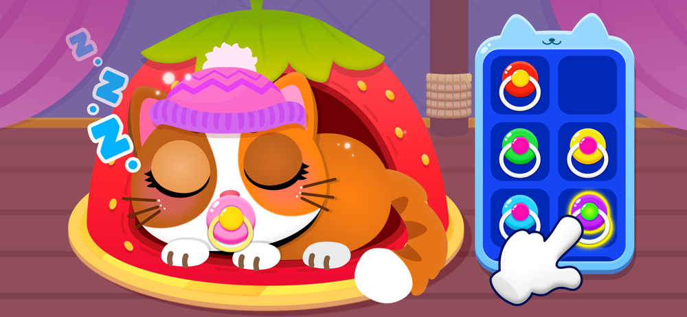 In this mini-game, your little one will choose a comfortable bed for the cat, feed it a tasty milk bottle and give it a warm hat. Create a cozy atmosphere for your pet and make sure it gets a good night's sleep!