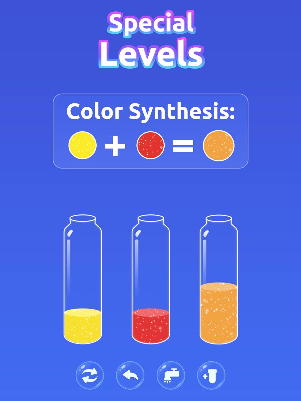 • Special Levels: Brain-training puzzles with hidden top water colors (Question Mark levels) and color synthesis challenges (Synthesis levels).