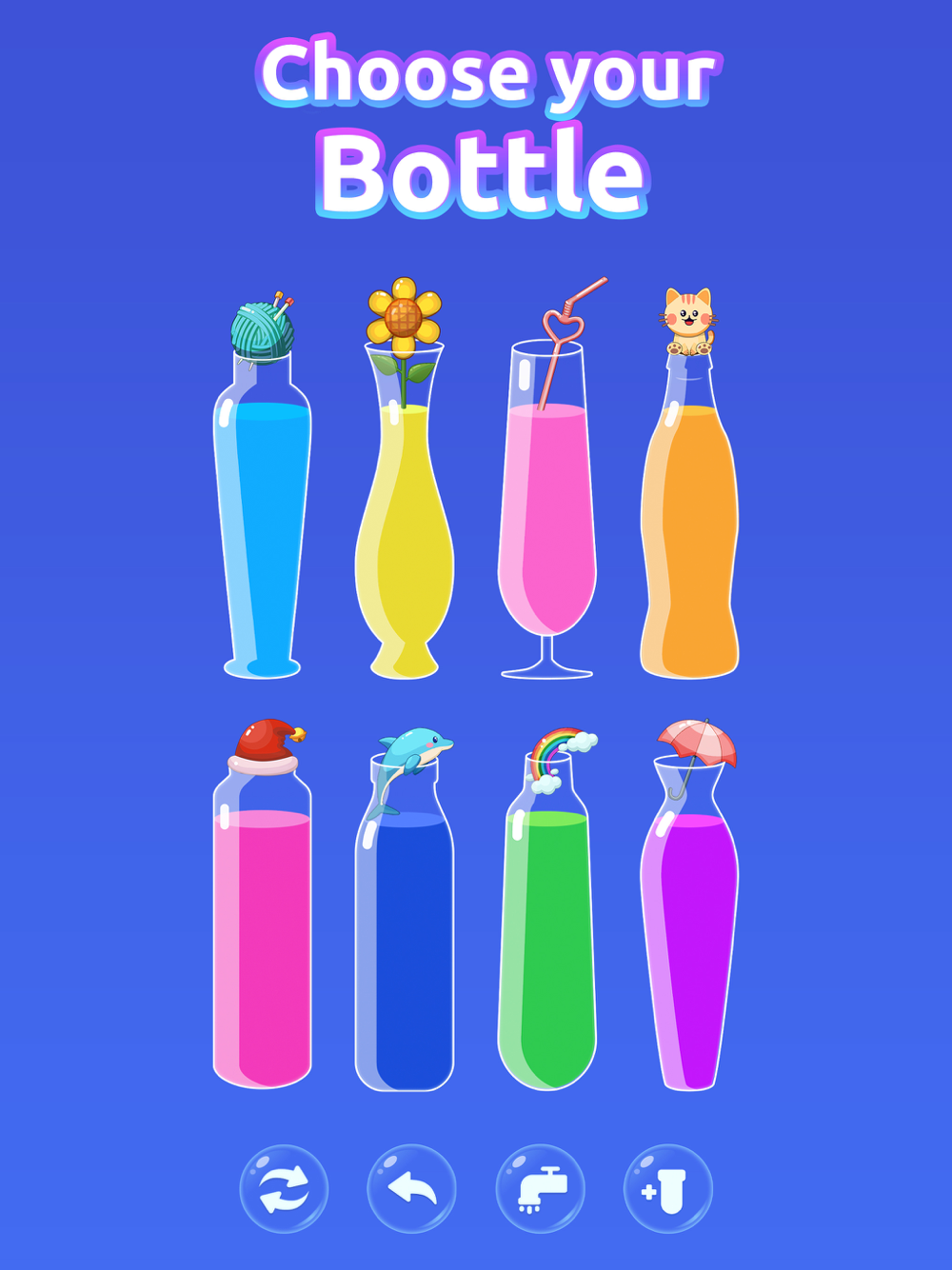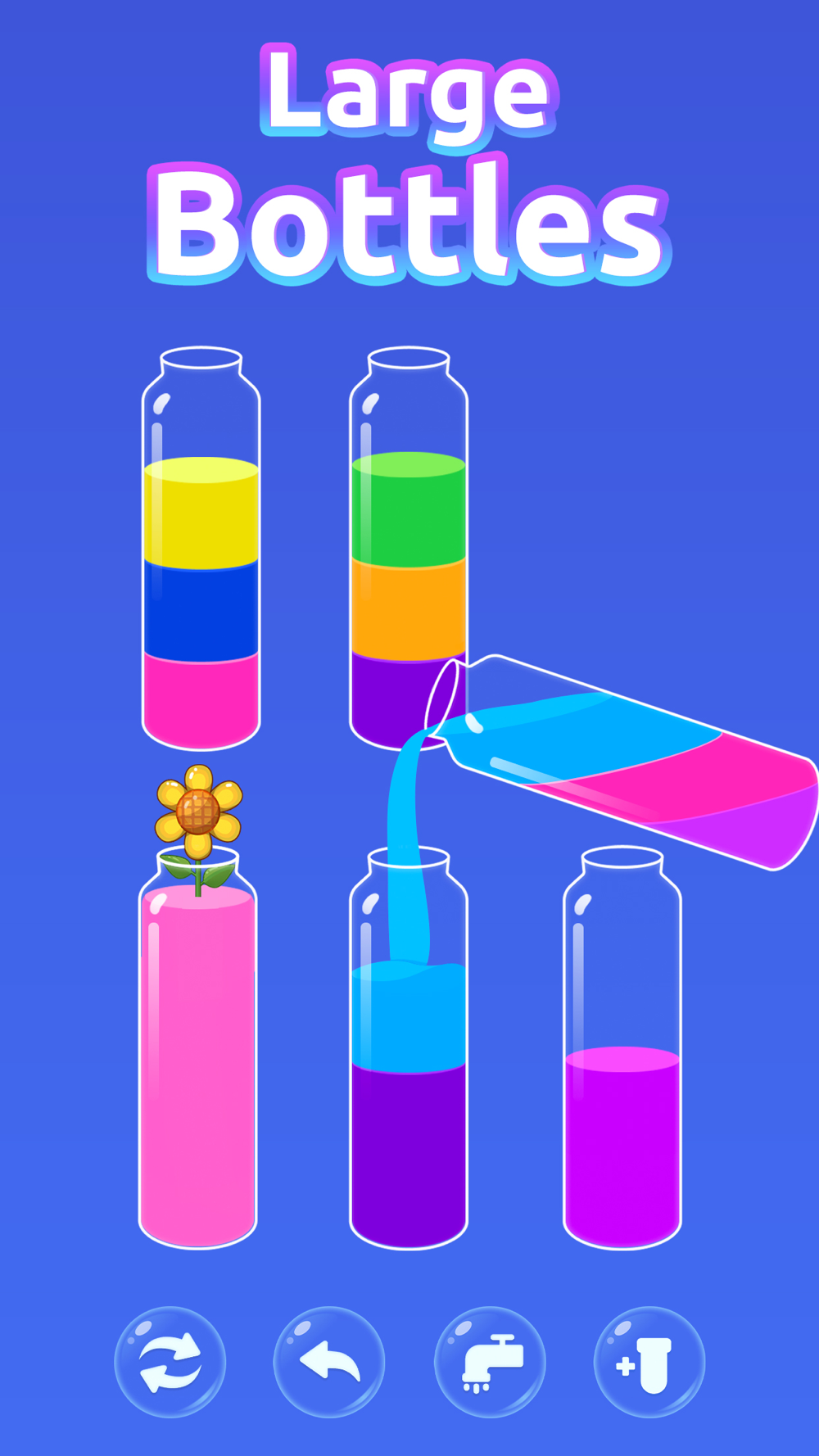 • Helpful Hints: Tools like undo, drain, and tube to enhance gameplay. Use the tube for new bottle transfers and the drain to remove liquid from the bottom.