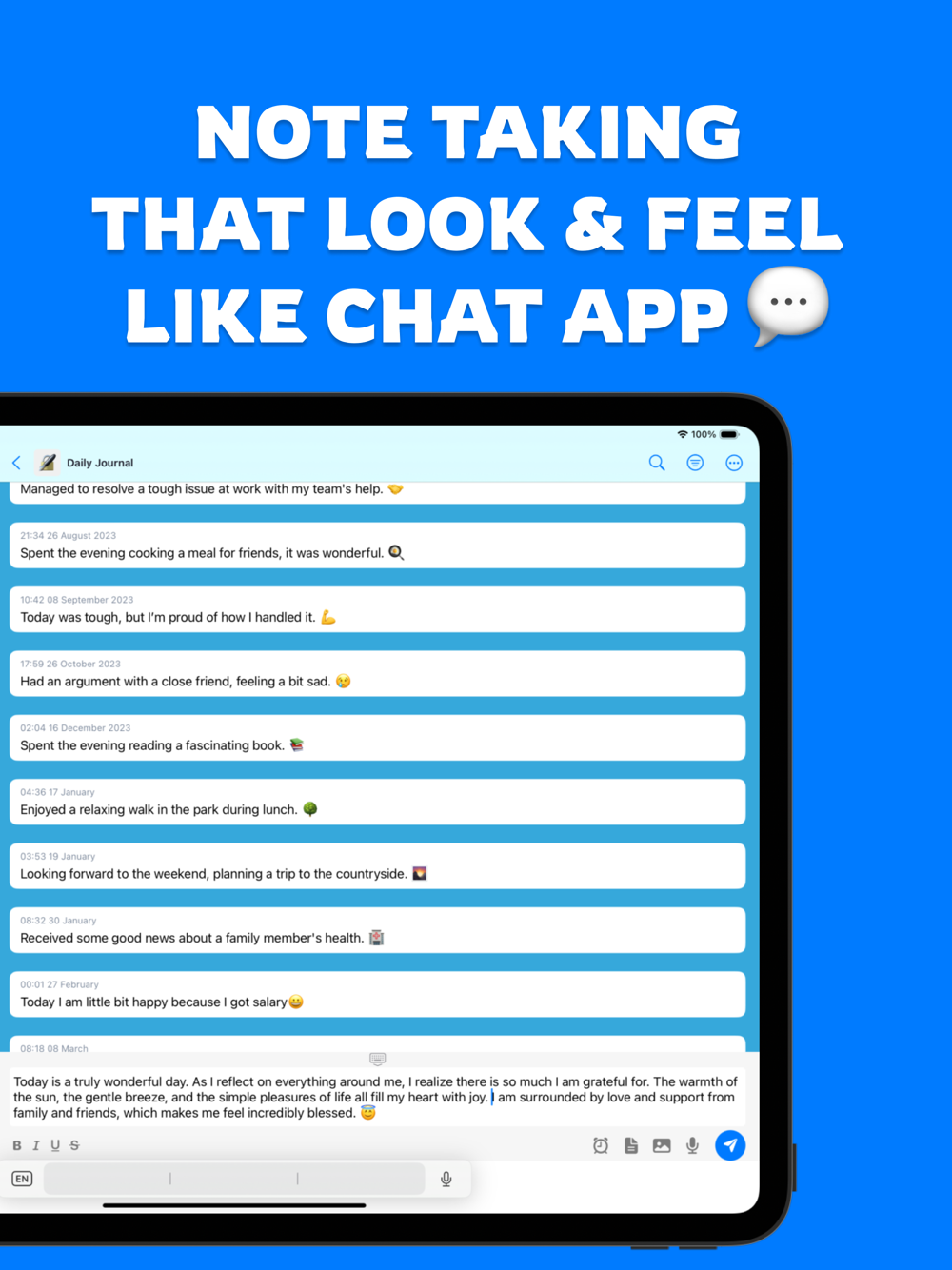 Chat-Style Notes: Every note you take is timestamped and displayed in a conversational format, giving your logs a clear and organized appearance, just like a chat.